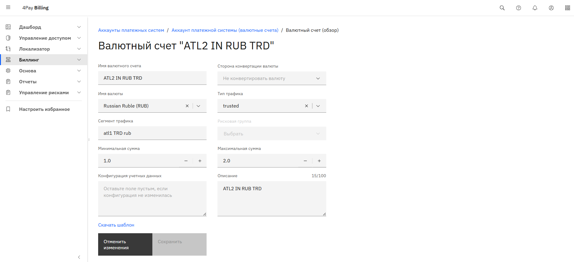 В разделе редактирования валютного счета можно изменить имя и описание валютного счета, имя валюты, тип и сегмент трафика. Также здесь можно установить минимальную и максимальную сумму платежа, вписать конфигурации учетных данных.