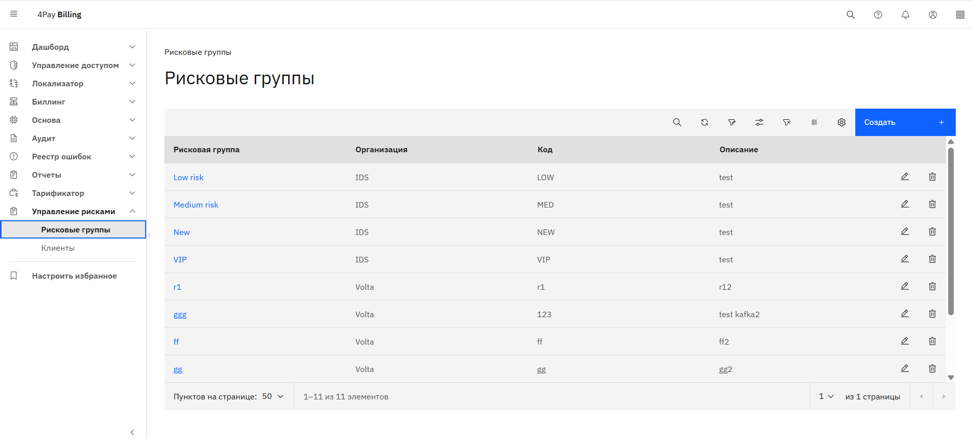Здесь отображаются все рисковые группы, доступные пользователю и его организации. Администратор может быстро редактировать, удалить их или создать новые.