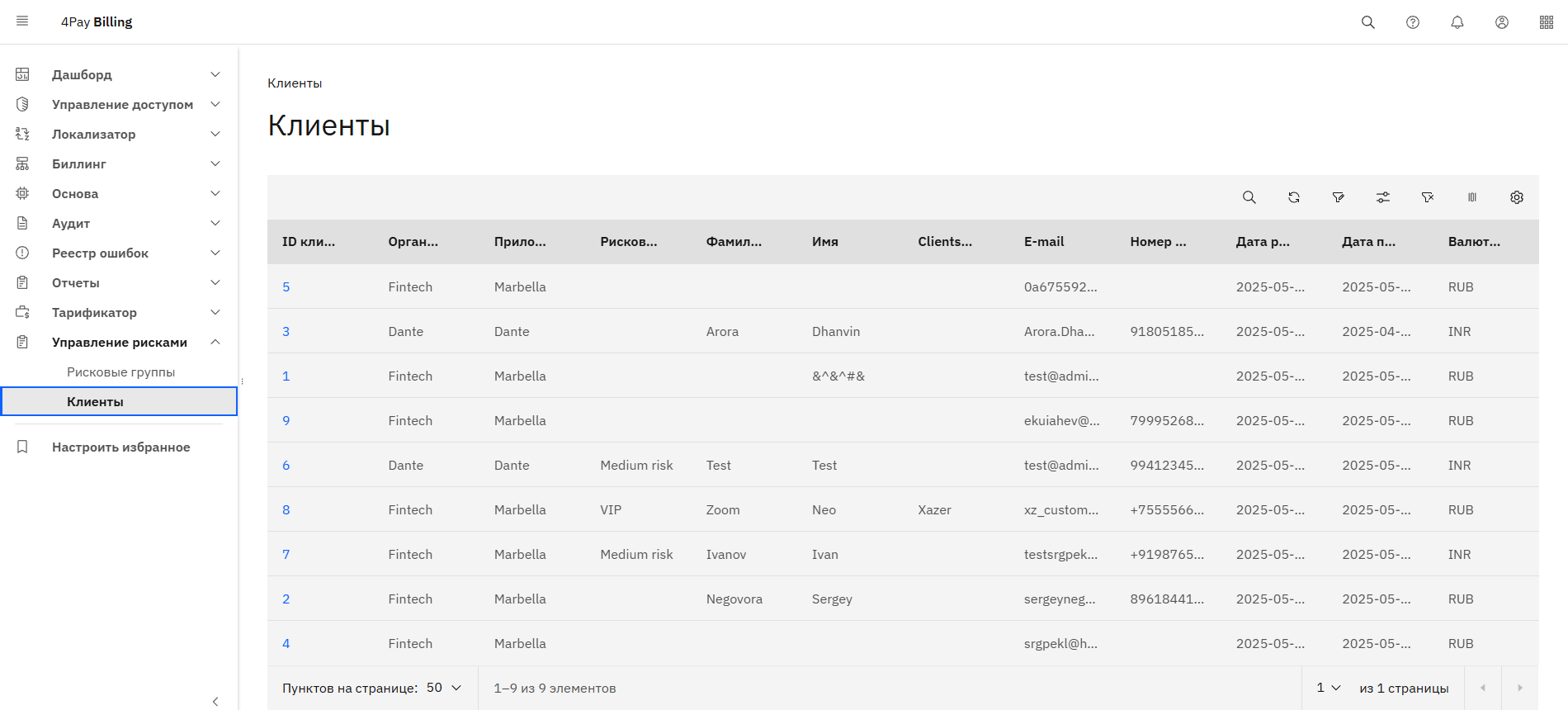 Здесь отображаются все клиенты, доступные организации пользователя. Также здесь указывается вся личная информация о клиенте, которая доступна. Нажатие на ID клиента открывает подробную информацию.