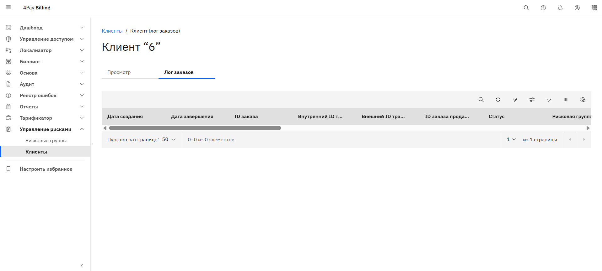Во вкладке Лог заказов можно просмотреть все транзакции, совершенные клиентом. Если нажать на ID заказа, то откроется подробная информация об искомой транзакции в продукте Биллинг.
