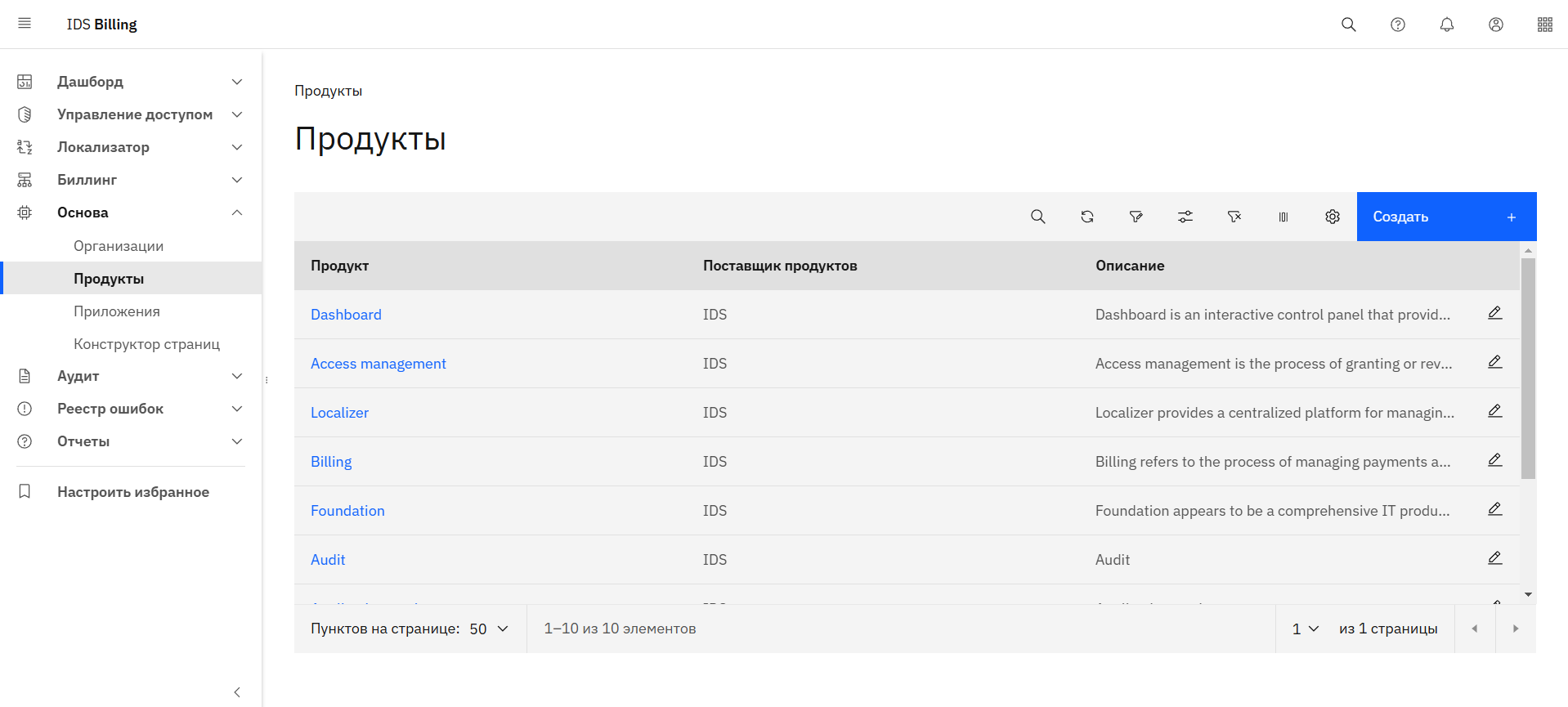 Здесь отображаются все продукты, зарегистрированные в системе. Также есть возможность их создания и редактирования. Продукты — это весь тот функционал, который доступен пользователю в левой части административной панели. Разработчик и поставщик основных продуктов (Биллинг, Управление доступом и т.д.) — компания IDS.