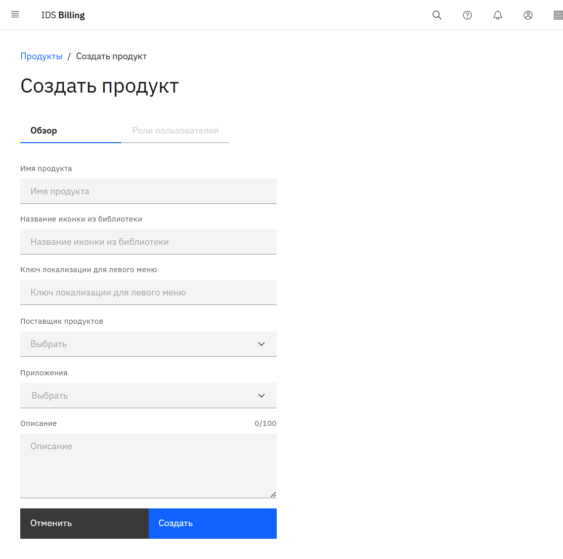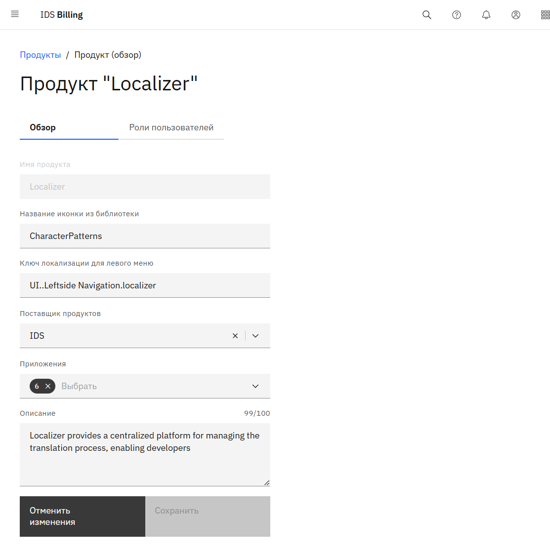 Редактировать продукт можно после нажатия на его название. В разделе редактирования 2 вкладки: “Обзор”, “Роли пользователей”. Во вкладке Обзор можно изменить: название иконки из библиотеки (отображаются слева от названия продукта), ключ локализации для левого меню, поставщика продукта, с какими приложениями продукт может взаимодействовать, описание продукта.