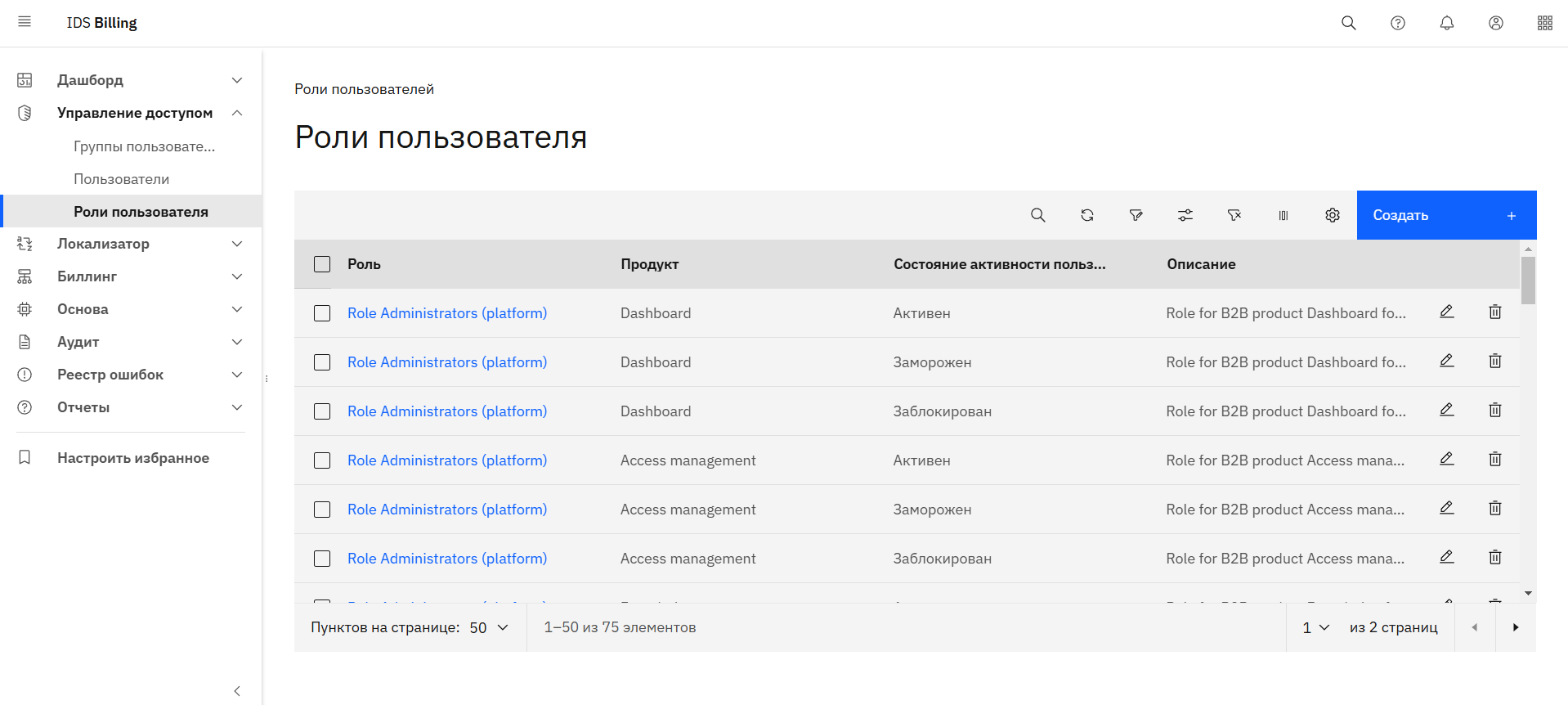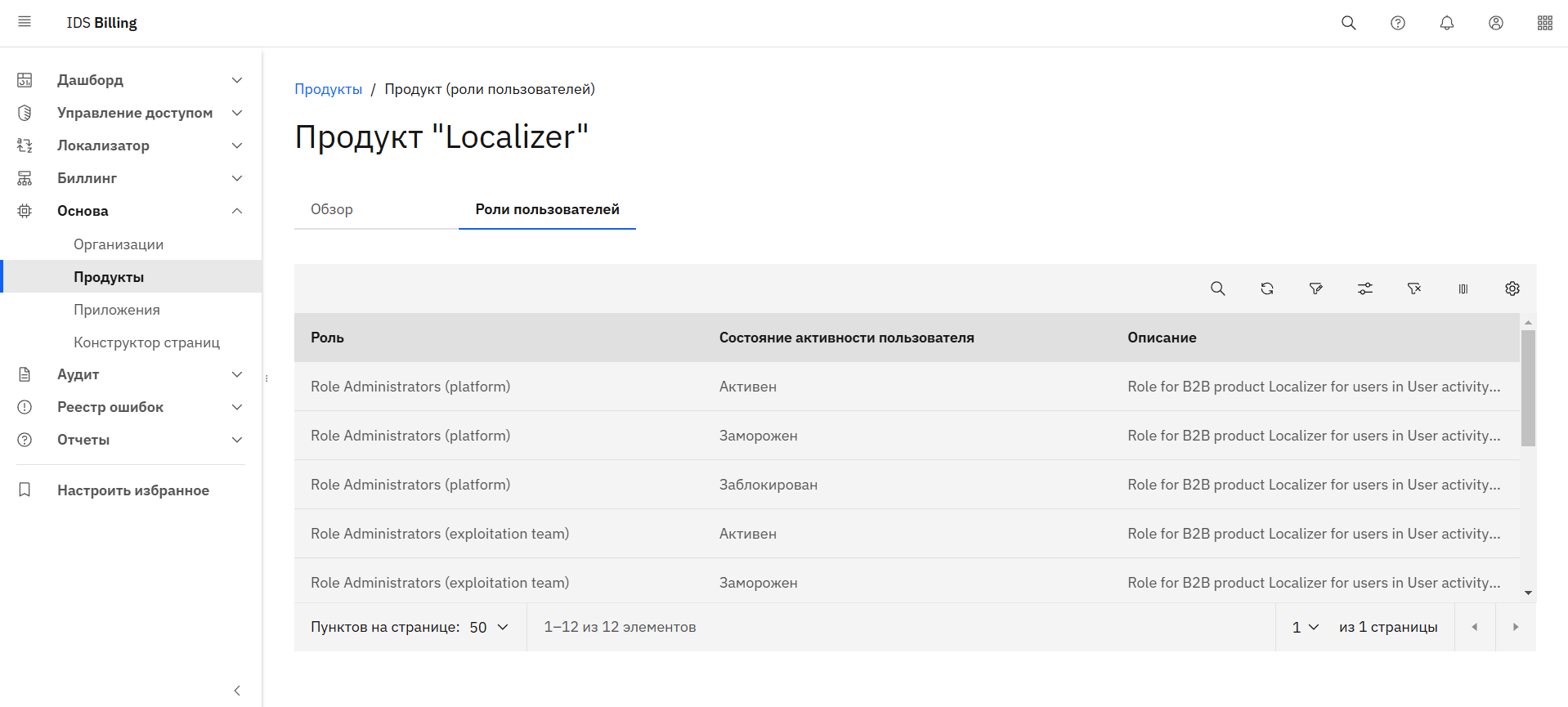 Здесь отображаются все роли, зарегистрированные в системе. Также есть возможность их создания и редактирования. У всех ролей отображаются: название, продукт, состояние активности пользователя, описание.