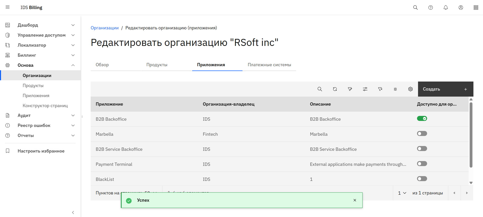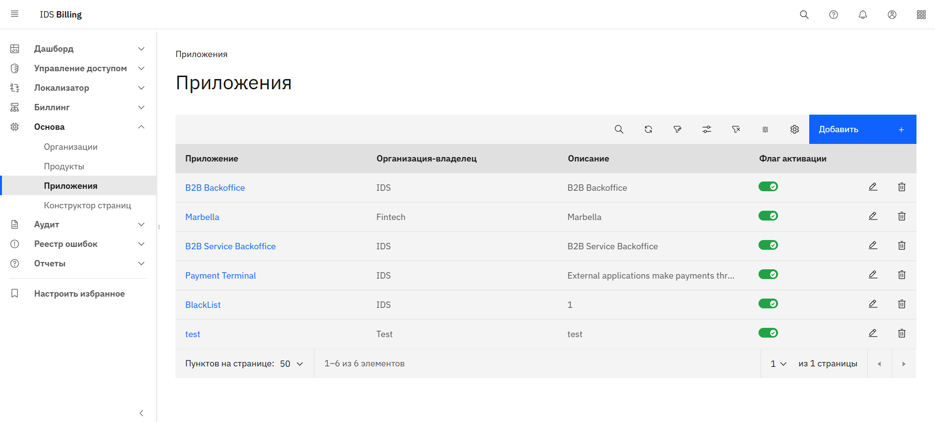 Здесь отображаются все внешние приложения, зарегистрированные в системе (сам интерфейс B2B Billing также считывается системой внешним приложением). Также есть возможность их создания и редактирования. У всех приложений отображаются: название, организация-владелец, описание. Также здесь можно быстро активировать/деактивировать приложение.