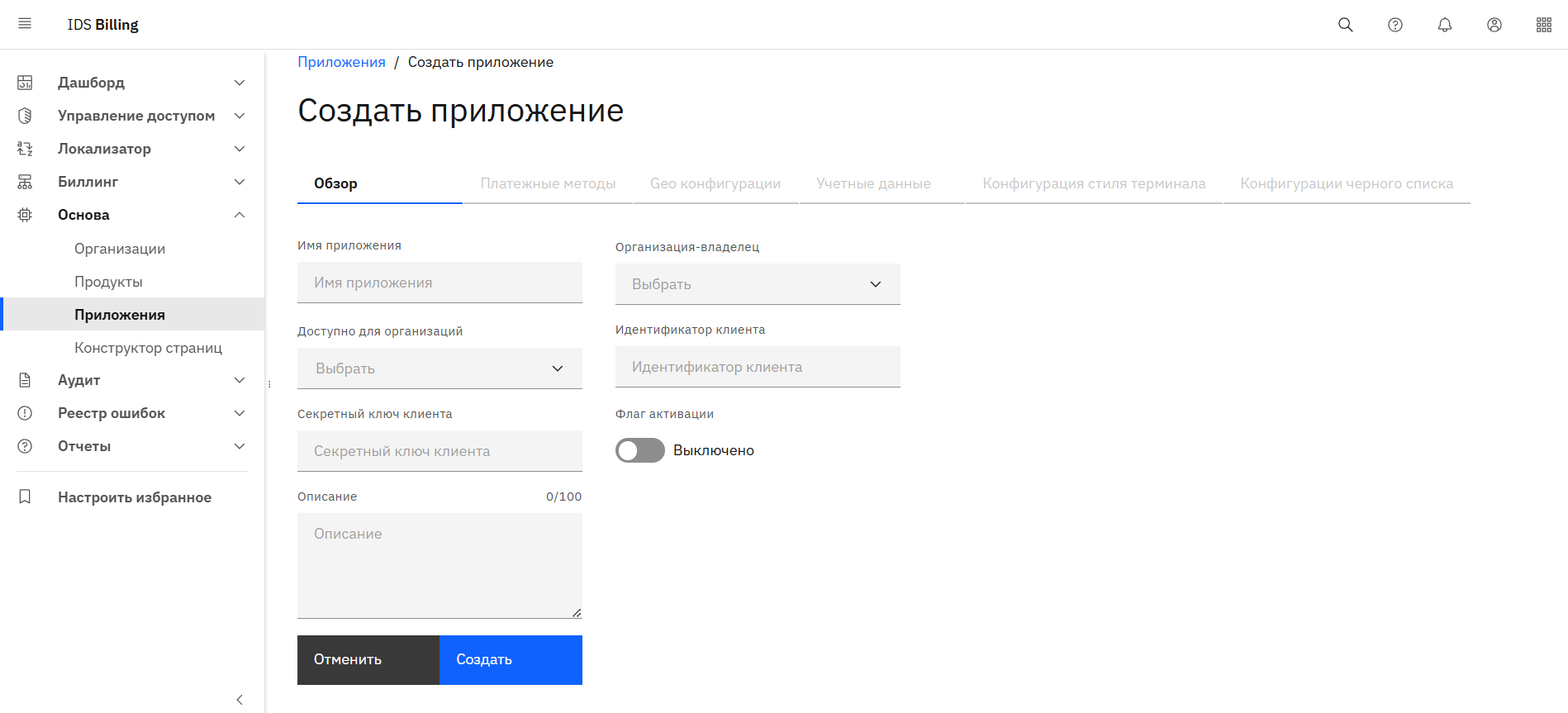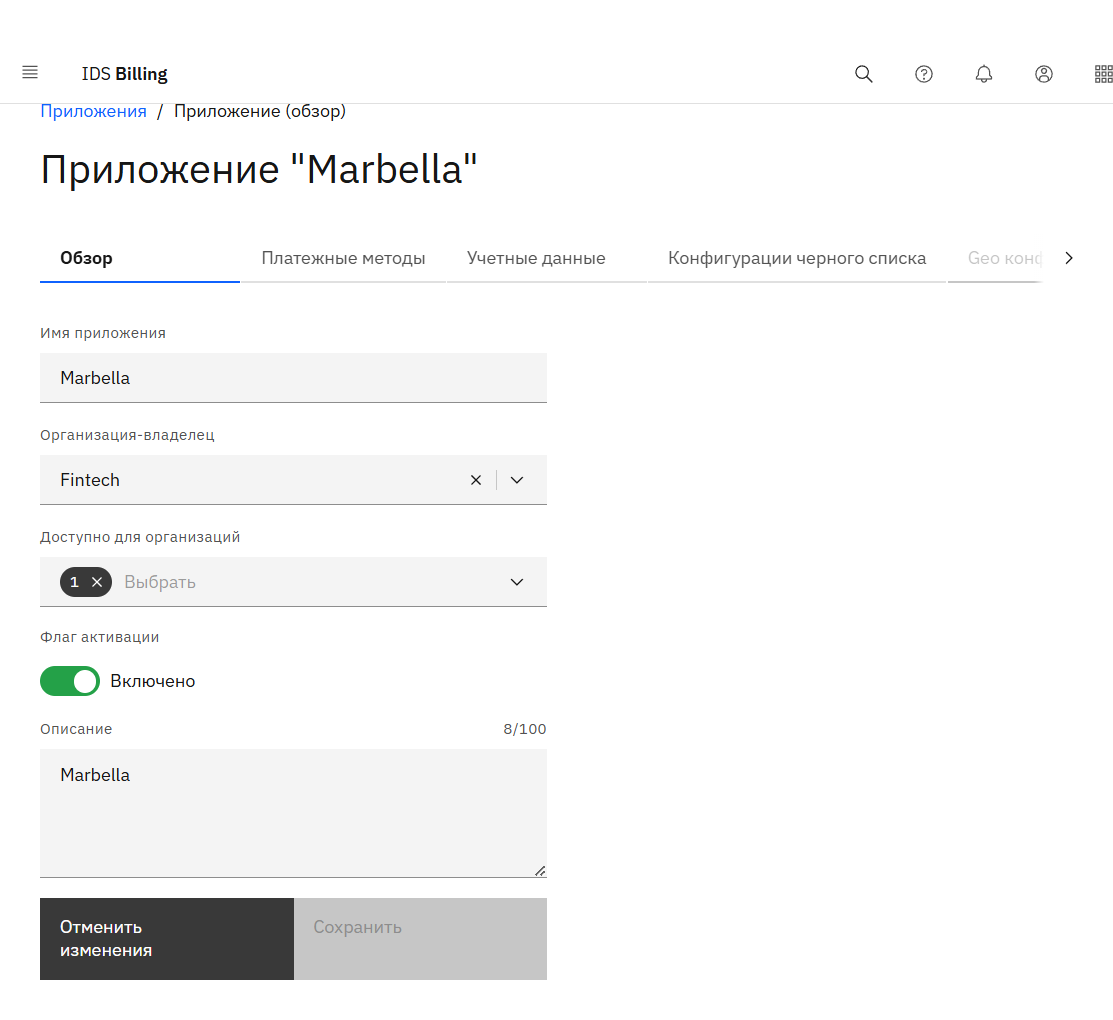 Редактировать приложение можно после нажатия на его название. В разделе редактирования 6 вкладок: “Обзор”, “Платежные методы”, “Учетные данные”, “Конфигурация черного списка”, “Geo конфигурации”, “Конфигурация стиля терминала”. Во вкладке Обзор можно изменить: название приложения, доступность для определенных организаций, состояние активации/деактивации, описание.