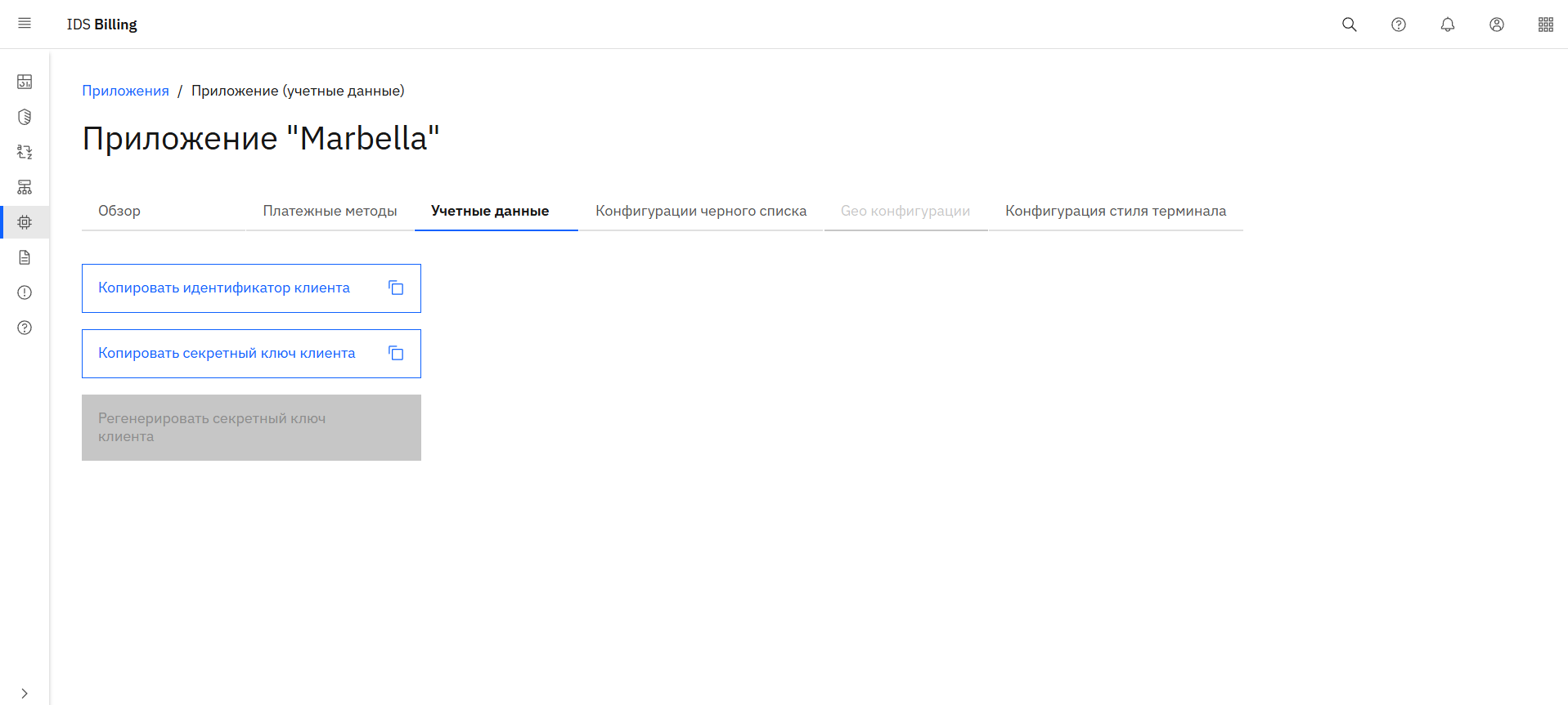 Во вкладке Учетные данные можно скопировать идентификатор и секретный ключ клиента для конкретного приложения. Они необходимы для подключения к этому приложению. Функция “Регенерировать секретный ключ клиента” в данный момент недоступна.