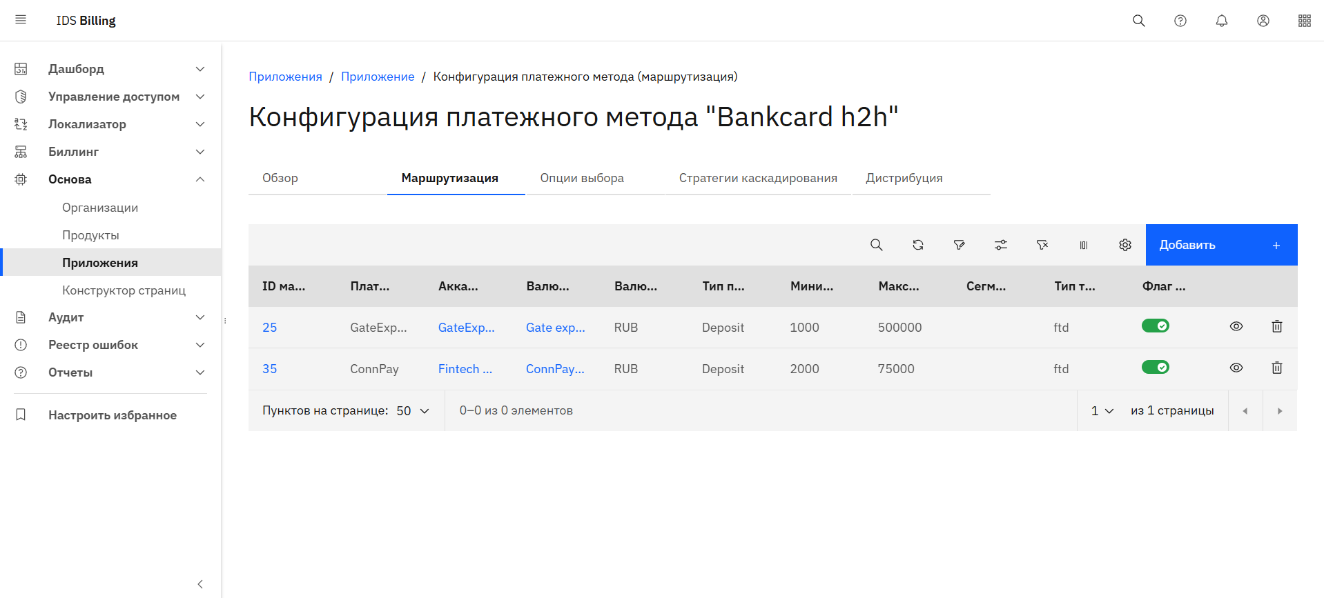 Во вкладке Маршрутизация в конфигурации платежного метода можно активировать/деактивировать конкретный маршрут способа оплаты (куда или откуда должны приходить деньги), а также посмотреть подробности уже настроенных маршрутов: ID маршрута платежного метода, платежную систему, аккаунт платежной системы, валютный счет, валюту, тип платежного метода, минимальное значение, максимальное значение.