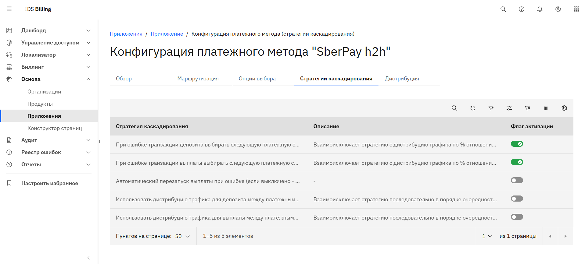 Во вкладке Стратегии каскадирования в конфигурации платежного метода можно выбрать нужную стратегию каскадирования с помощью активации/деактивации флагов. Если платежный маршрут не отработает, то какой брать следующим (в порядке очередности или по процентному соотношению). Обратите внимание на описание стратегий, часть из них являются взаимоисключающими. Здесь вы либо ставите приоритет платежных систем по их очередности, либо по процентам. Оба этих параметра настраиваются во вкладке дистрибуция.