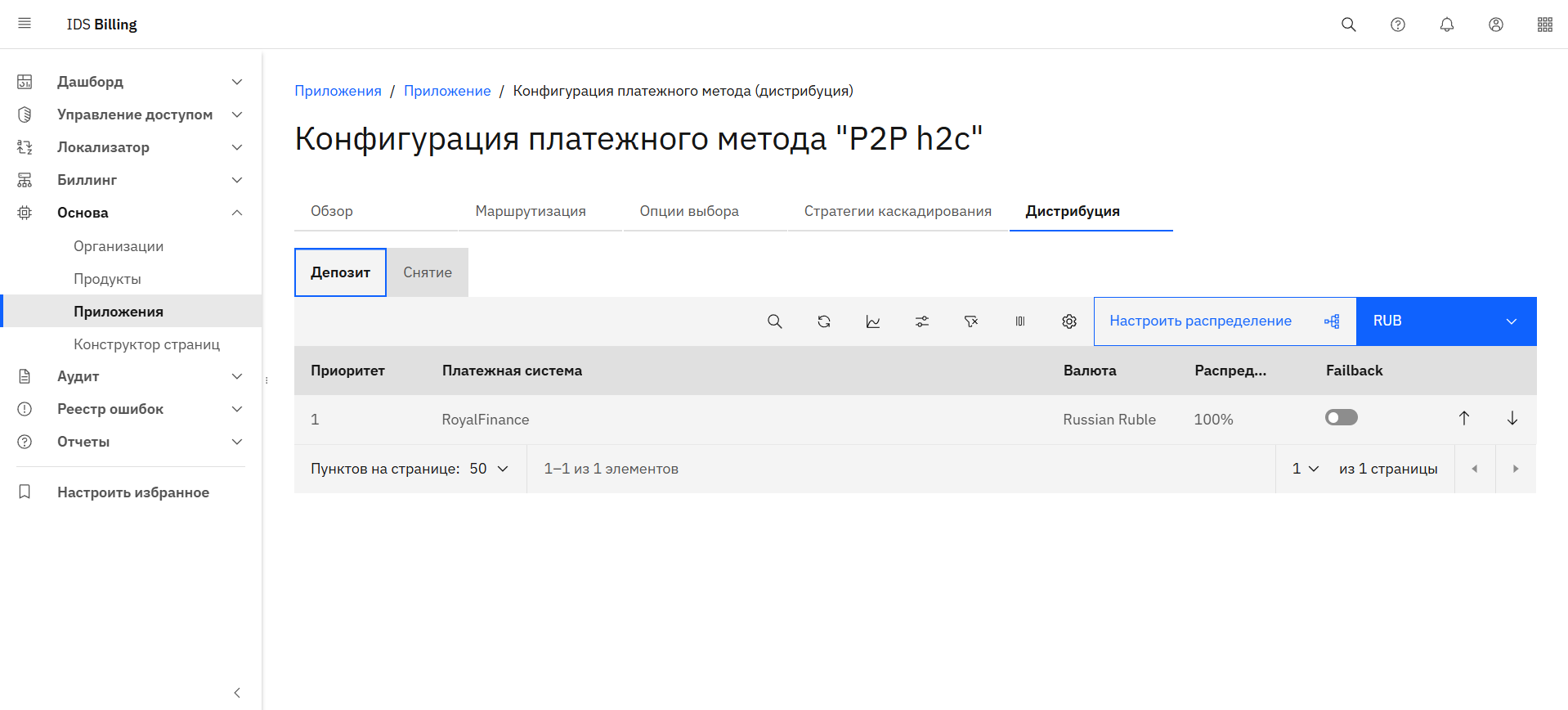Если есть нескольких активных платежных систем, то во вкладке Дистрибуция можно распределять трафик между ними. Для этого нужно выбрать валюту, нажав на синюю кнопку вверху таблицы. Затем необходимо нажать “Настроить распределение”, после чего можно будет изменить процент трафика для каждой платежной системы.