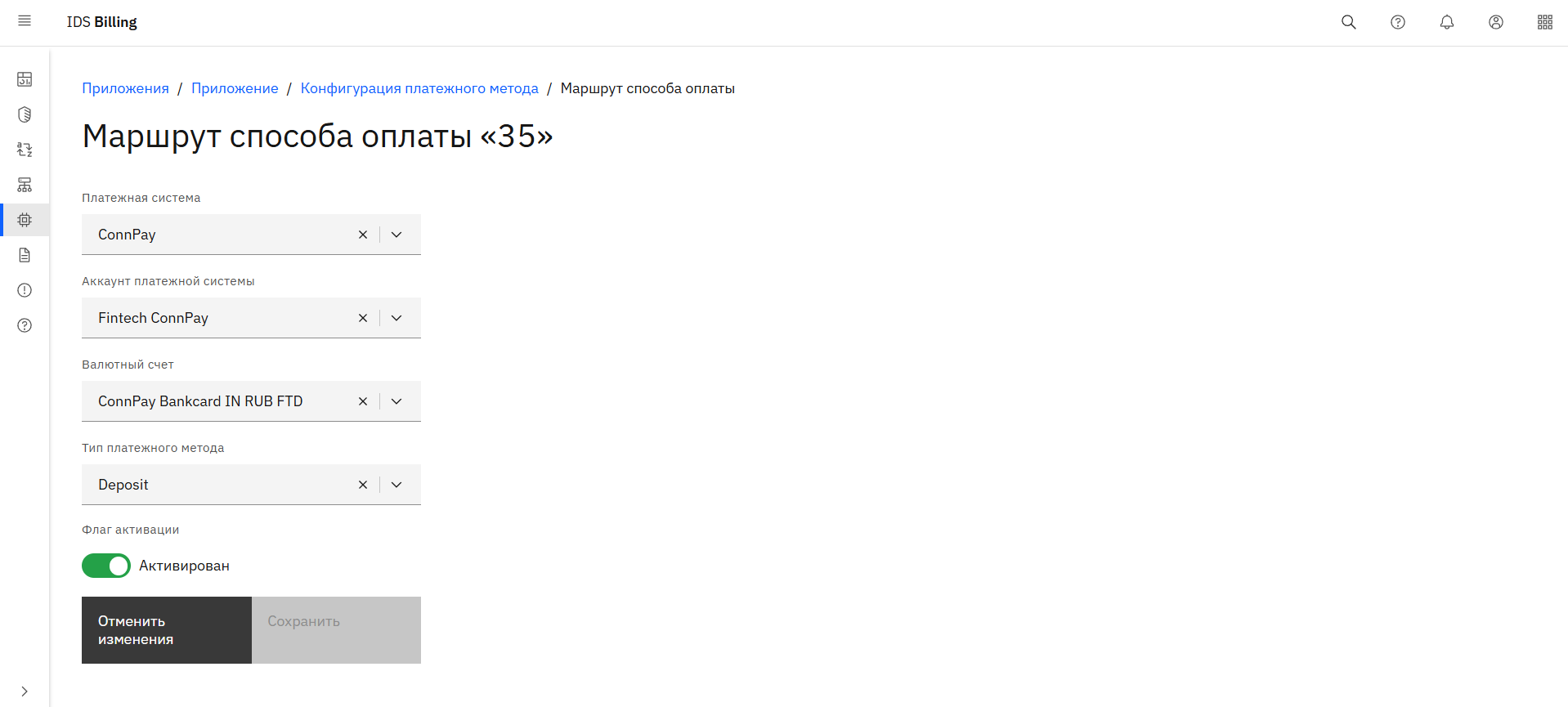 При редактировании маршрута, можно выбрать для него платежную систему, аккаунт платежной системы, валютный счет, тип платежного метода из доступных (депозит или вывод). Также, здесь можно активировать/деактивировать этот маршрут способа оплаты.