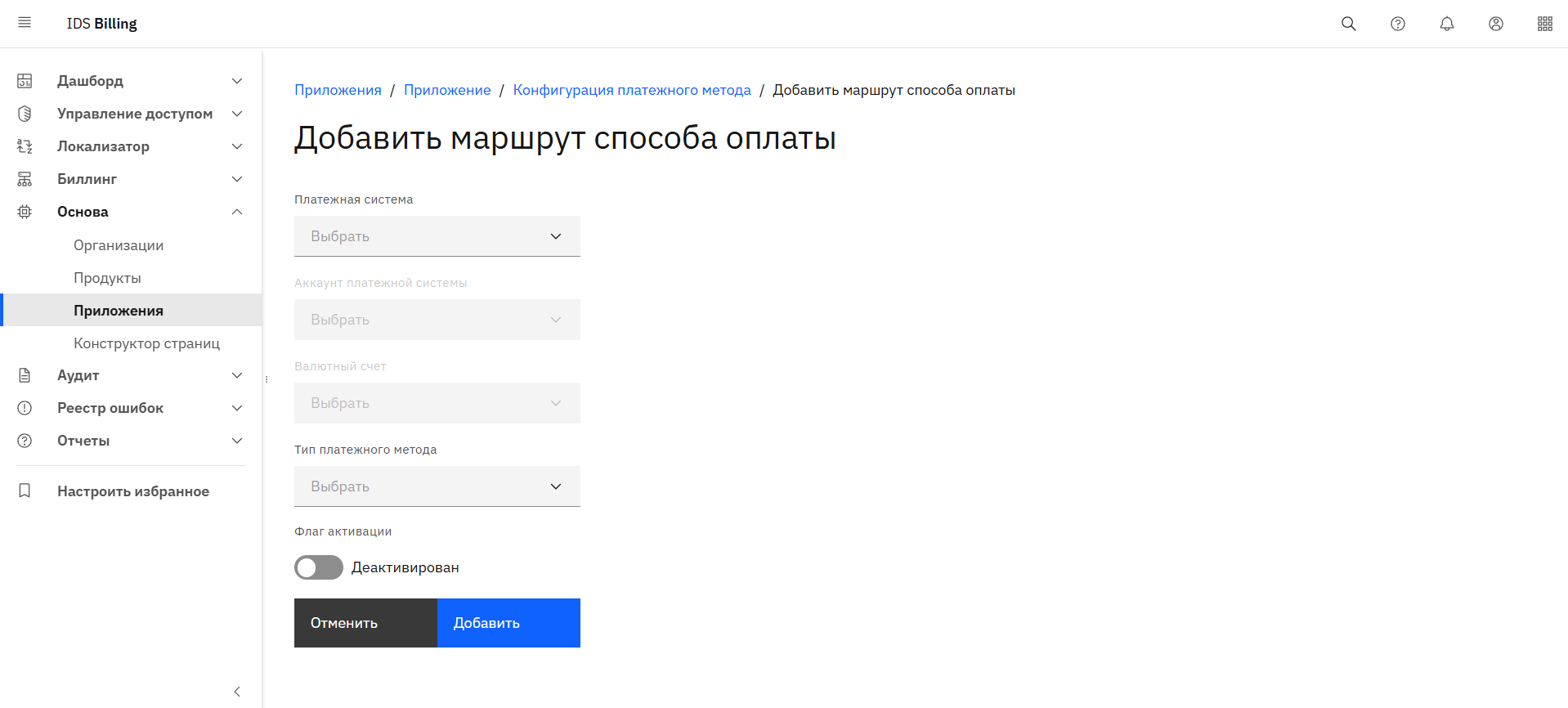 Вернемся во вкладку Платежные методы подраздела Приложения. Помимо редактирования готовых конфигураций платежного метода, здесь можно добавить новую конфигурацию.