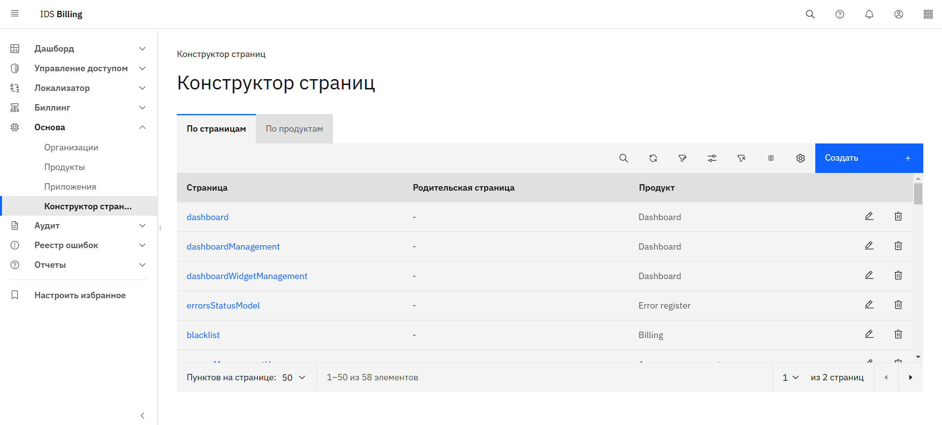 Здесь отображаются все страницы, зарегистрированные в системе. Также есть возможность их создания и редактирования. У каждой страницы указана родительская страница, если такая существует. Для редактирования страницы нужно нажать на ее название. Для добавления новой — на кнопку “Создать”.