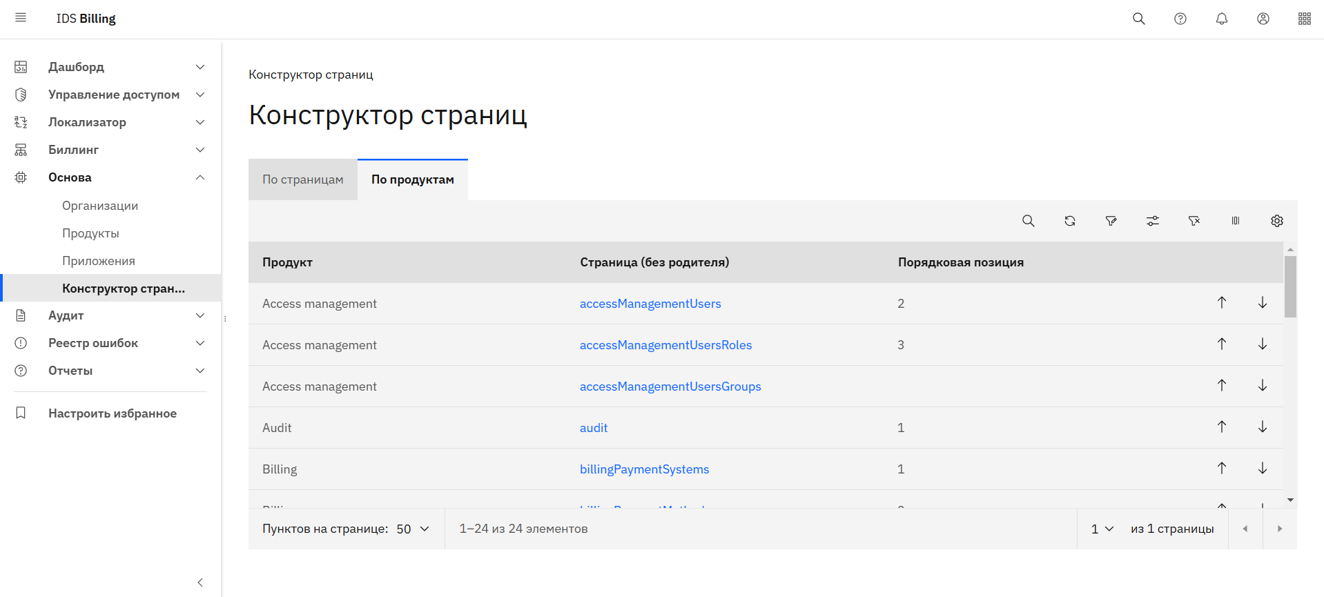 Если перейти в раздел “По продуктам”, то начнут отображаться только верхнеуровневые страницы (подразделы продуктов). Например, Конструктор страниц будет называться “pageBuilder”. Здесь можно поменять порядок подразделов в продуктах. Для того, чтобы поставить подраздел Конструктор страниц верхним в продукте Основа, нужно найти его в списке и поднять выше на 3 позиции. Это делается с помощью стрелок, которые находятся в правой области таблицы. Все изменения отображаются не моментально, а когда система обновится. Это происходит каждые 5 минут.