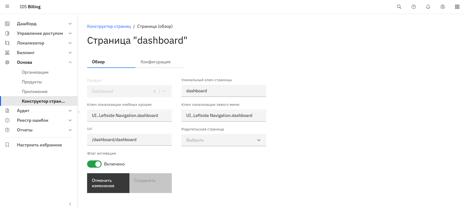 В разделе редактирования 2 вкладки: “Обзор”, “Конфигурация”. Во вкладке Обзор можно изменить ключ локализации хлебных крошек, url, уникальный ключ страницы, ключ локализации левого меню и выбрать родительскую страницу. Также здесь можно включить или отключить страницу.