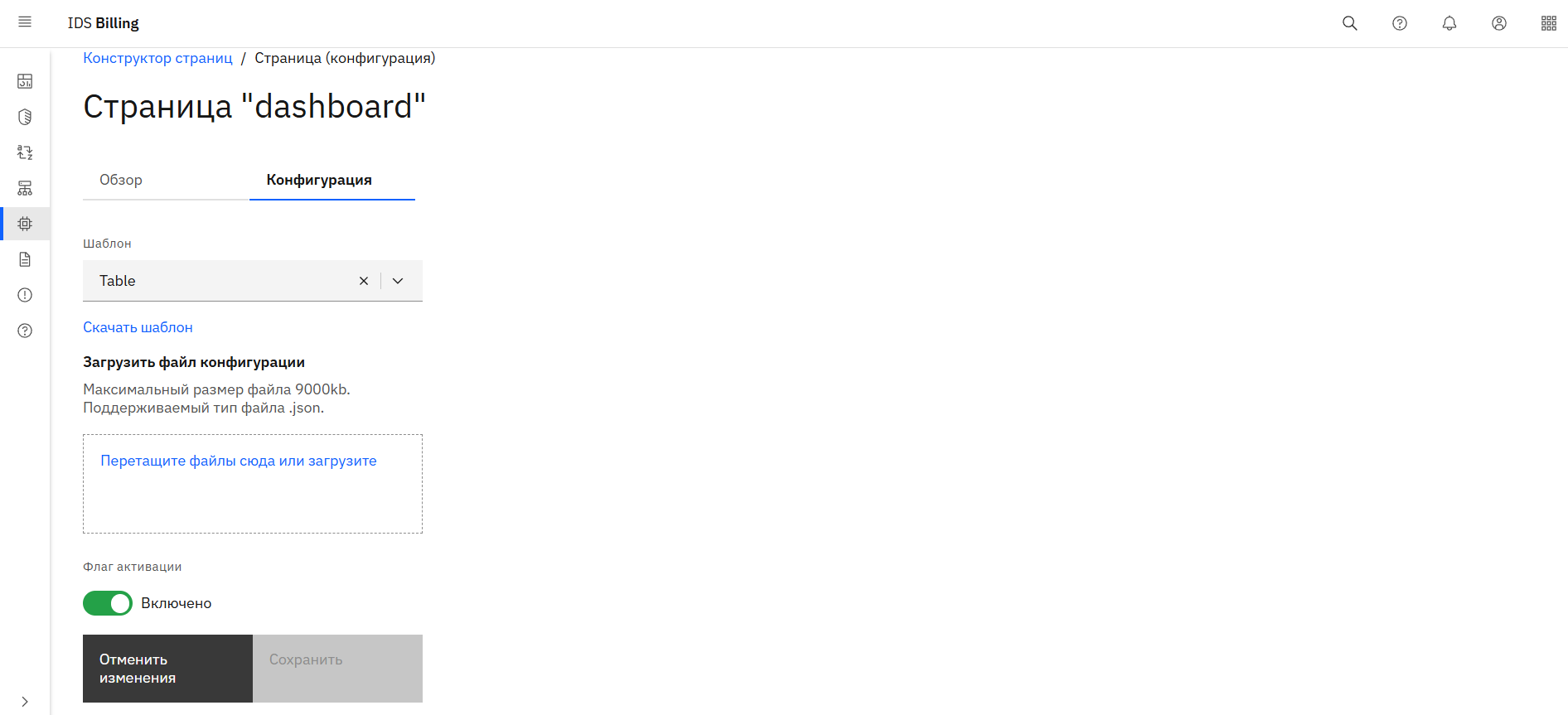Во вкладке Конфигурация можно: выбрать файл конфигурации из имеющихся шаблонов, скачать шаблон, настроить его в текстовом формате (указать, какое количество колонок и т.д. должно быть на странице) и загрузить свой файл конфигурации в формате json, включить или отключить страницу.
