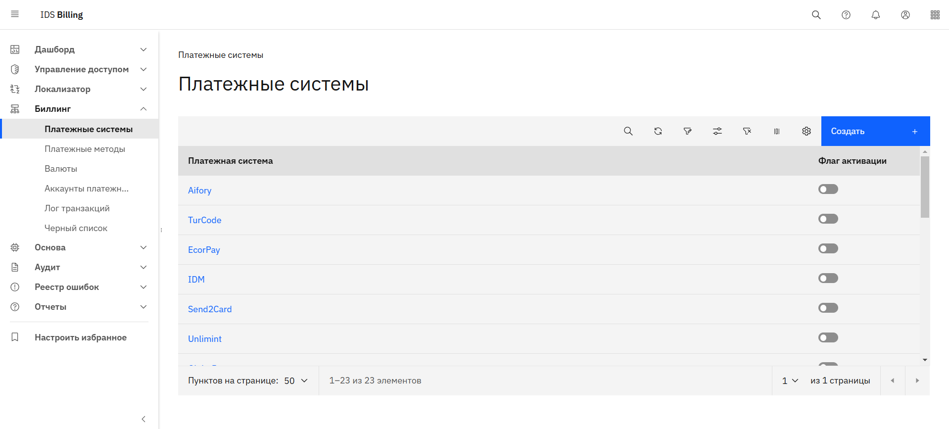 Здесь отображаются все платежные системы, зарегистрированные в системе. В данном подразделе можно активировать/деактивировать определенную платежную систему, перейти к ее редактированию или создать новую.