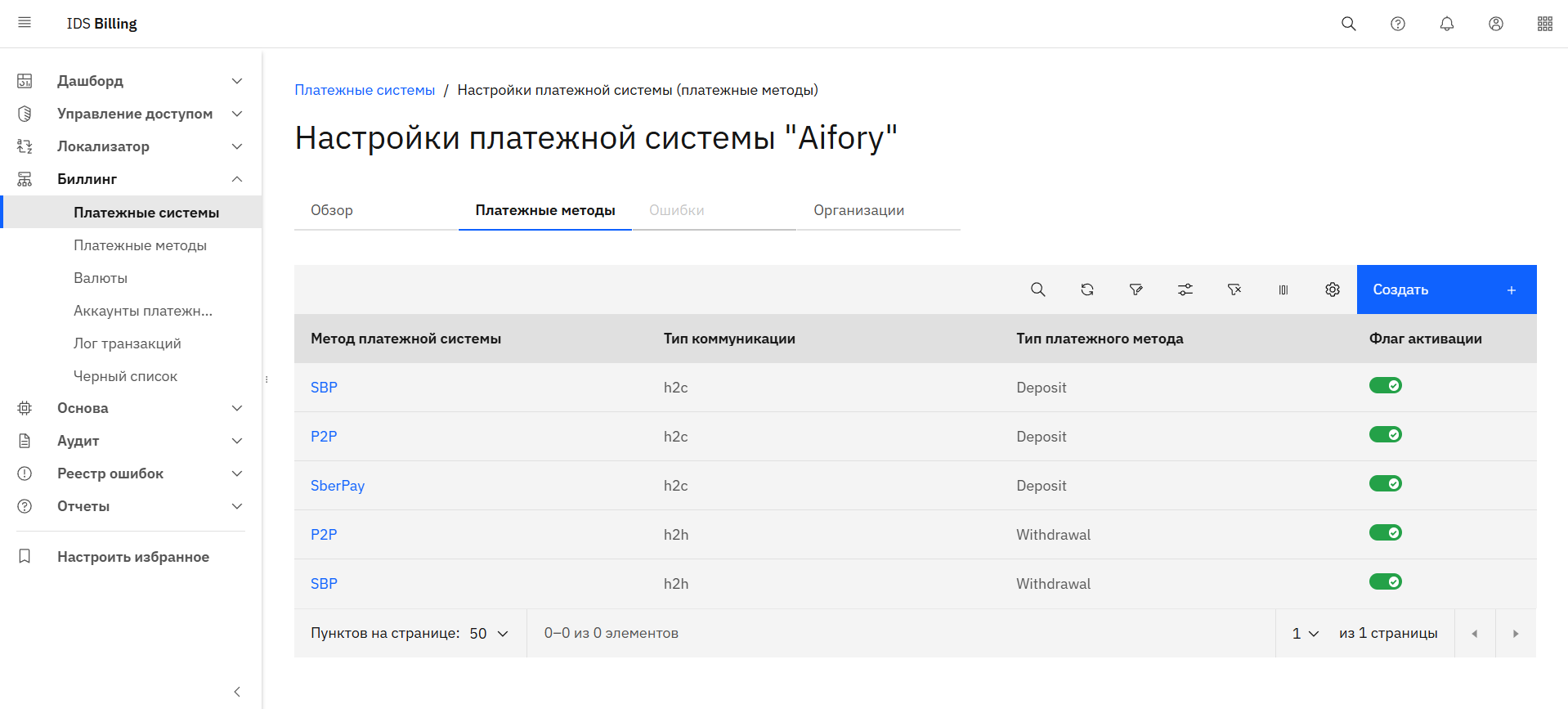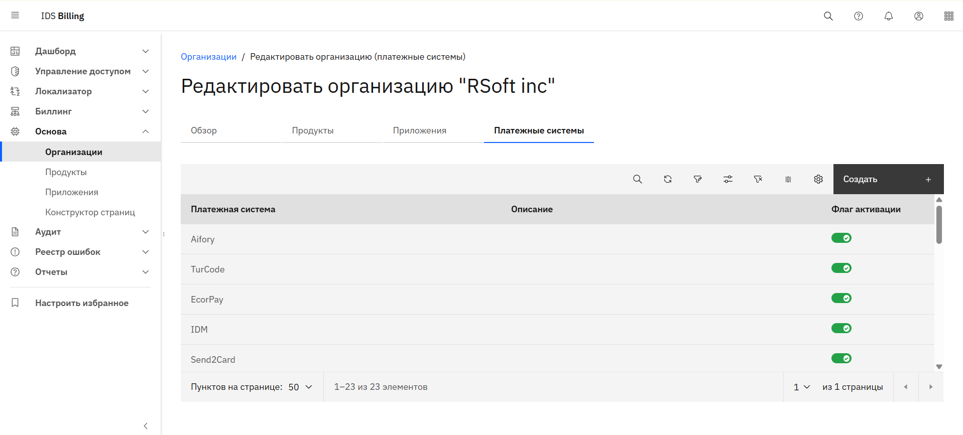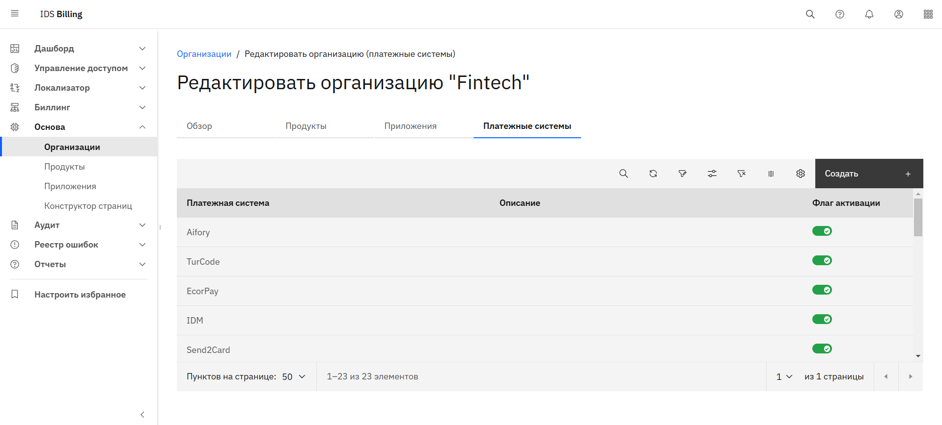 Во вкладке Платежные системы можно активировать те платежные системы, к которым у компании есть доступ по договору. К платежным системам подключаются те организации, у которых есть доступ к финансовому продукту Биллинг.