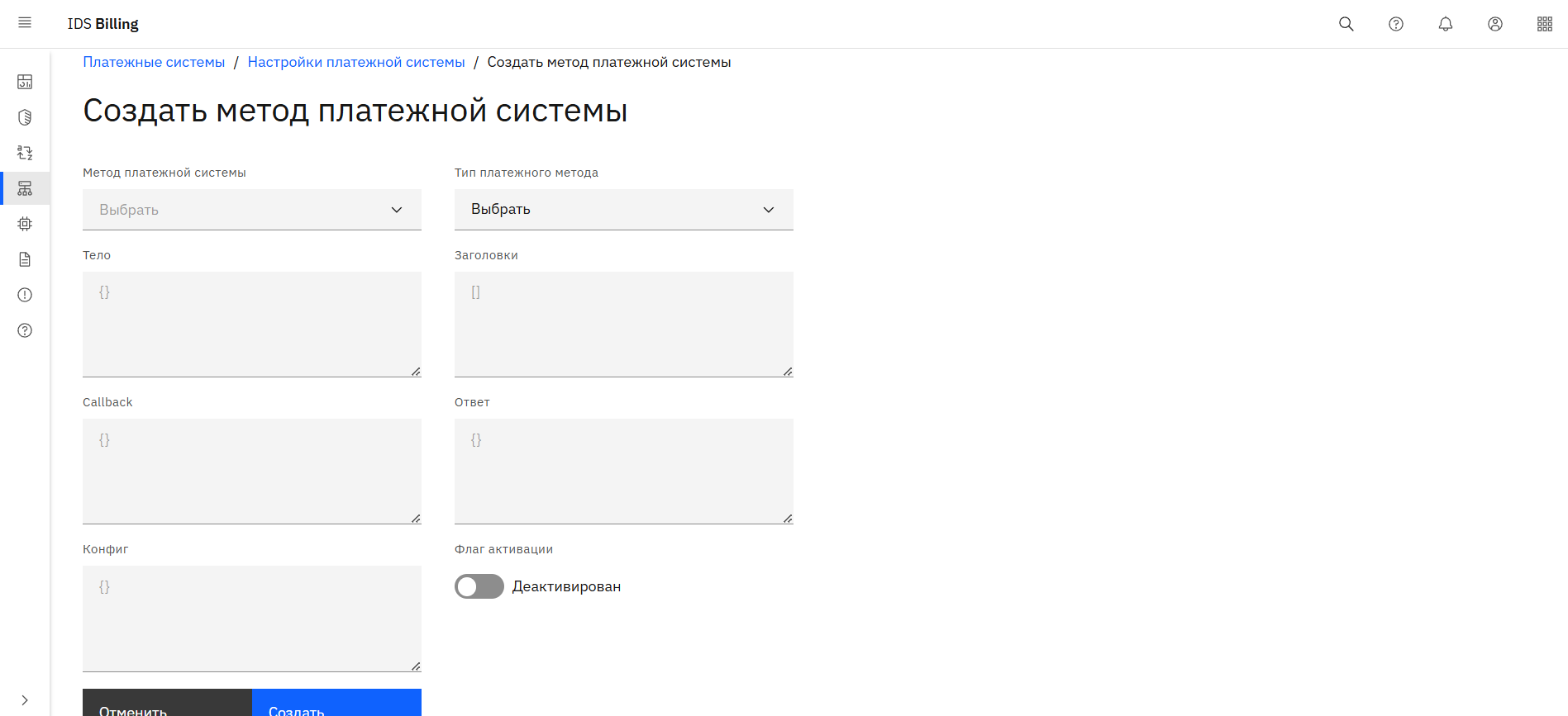 Перейти к настройкам платежного метода можно нажав на его название. Здесь можно выбрать метод платежной системы, тип платежного метода, а также прописать тело, заголовки, callback, ответ, конфиг. Внизу страницы можно включить или отключить данный метод платежной системы.