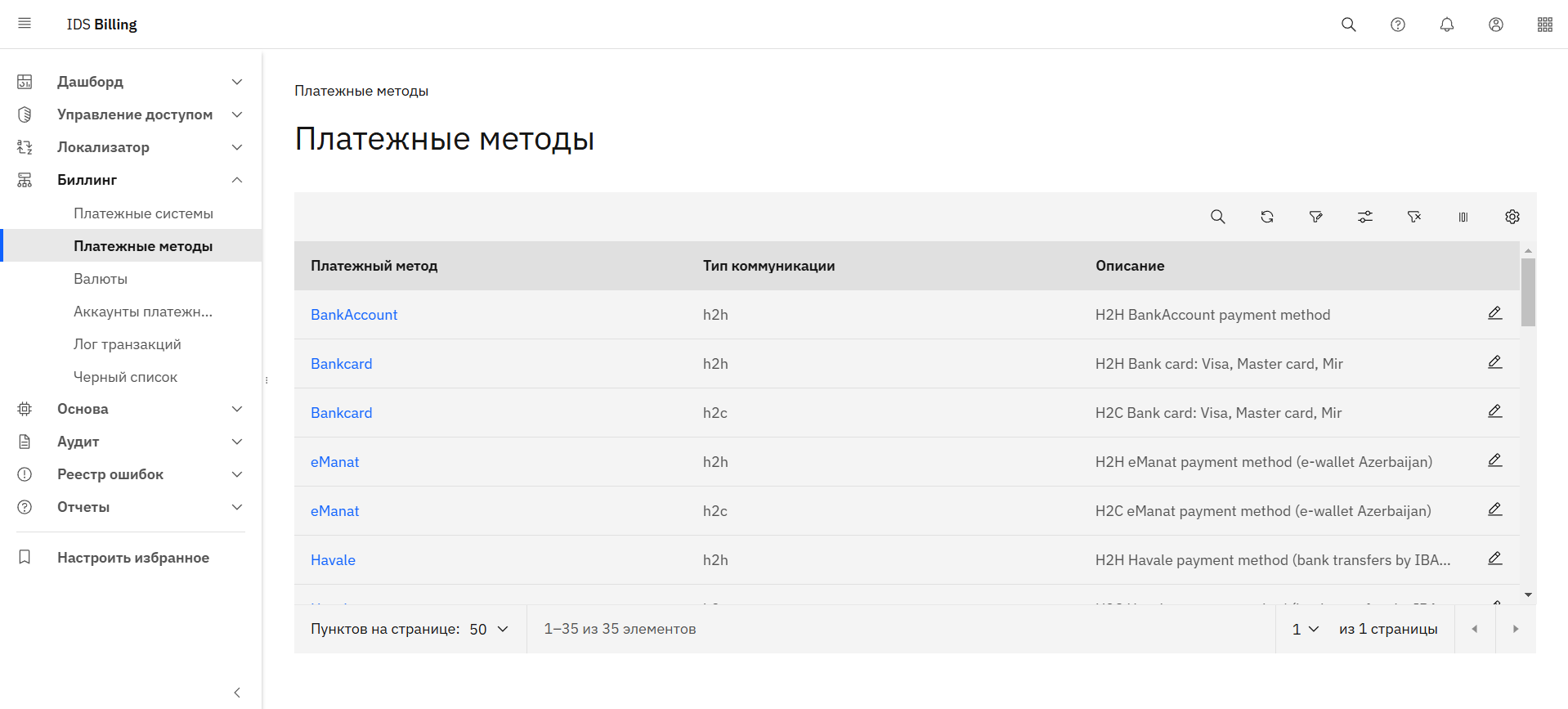 Здесь отображаются все платежные методы, их тип коммуникации и описание.