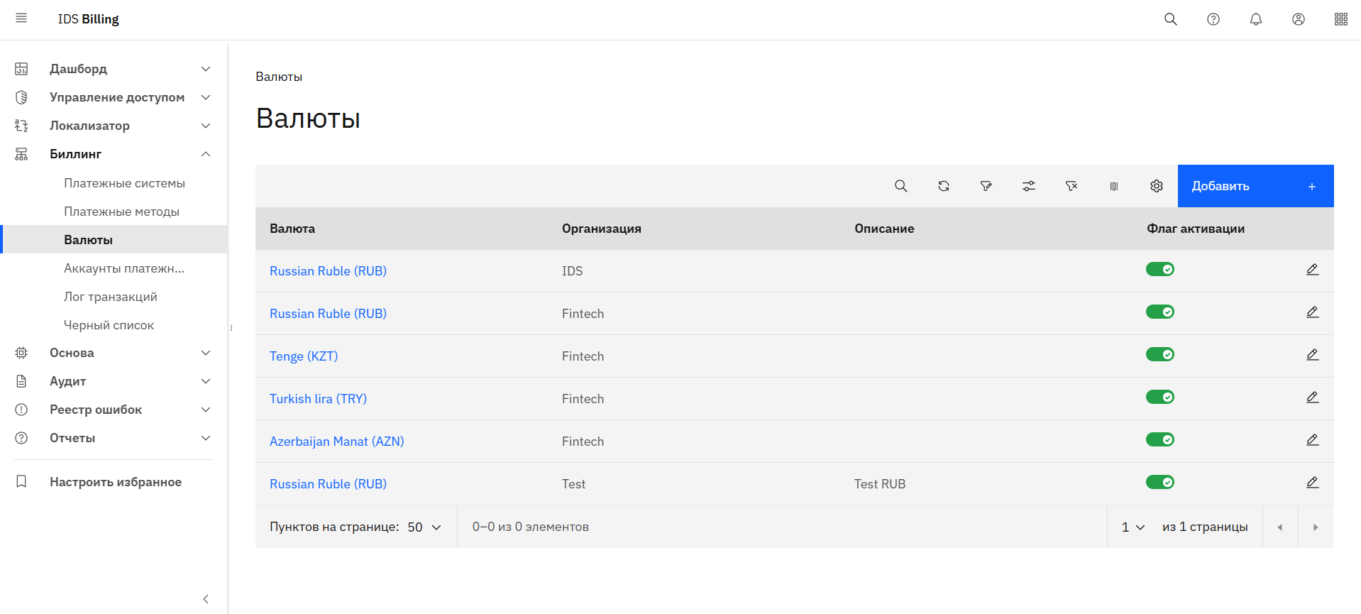 Здесь отображаются все валюты, зарегистрированные в системе. Валюта должна создаваться для каждой организации, потому что имеет гибкие настройки внутри. Поэтому в таблице может отображаться много одинаковых валют, например на скриншоте ниже 3 RUB. В данном подразделе можно активировать/деактивировать определенную валюту, перейти к ее редактированию или создать новую.