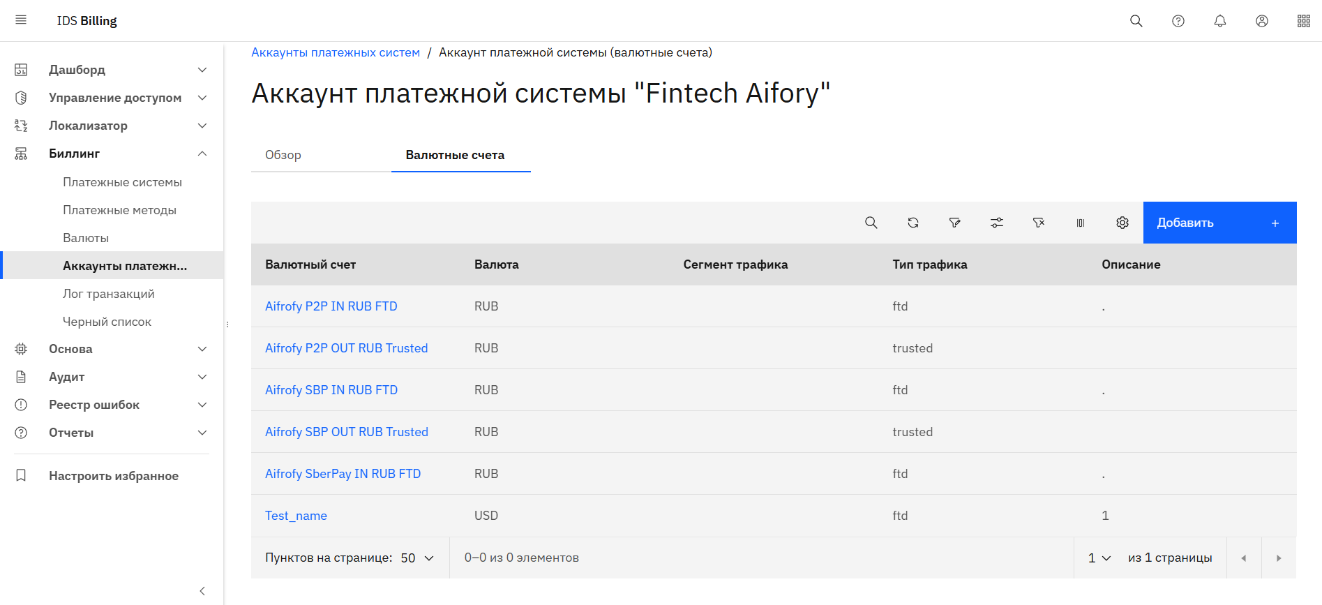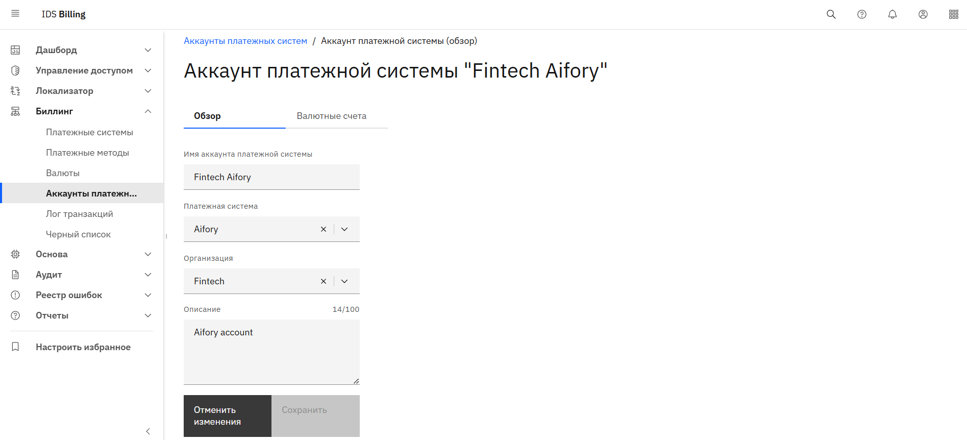 Аккаунт платежных систем — это договор организации с платежной системой. Здесь отображаются все аккаунты платежных систем, зарегистрированные в системе. Также есть возможность их создания и редактирования. За каждой организацией закреплен Аккаунт платежной системы, к которому прикреплены валютные счета компании.