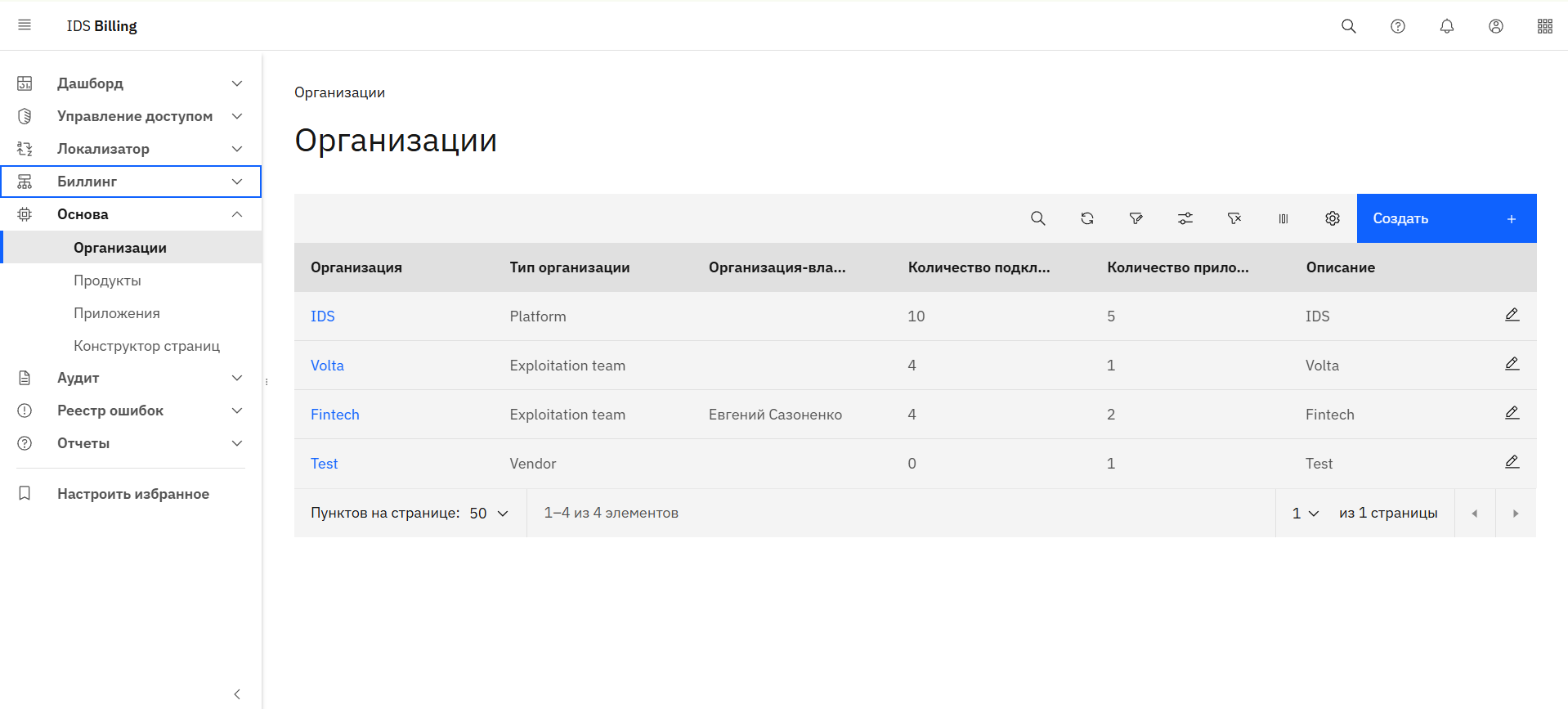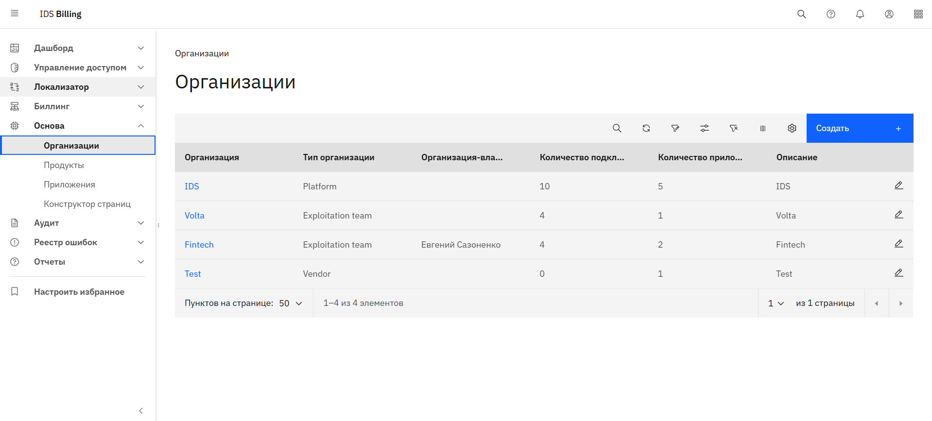 Здесь отображаются все организации, зарегистрированные в системе. Также есть возможность их создания и редактирования. У всех организаций отображаются: название, тип (Платформа, Вендор, Команда эксплуатации), организация-владелец, количество подключенных продуктов и приложений, описание.