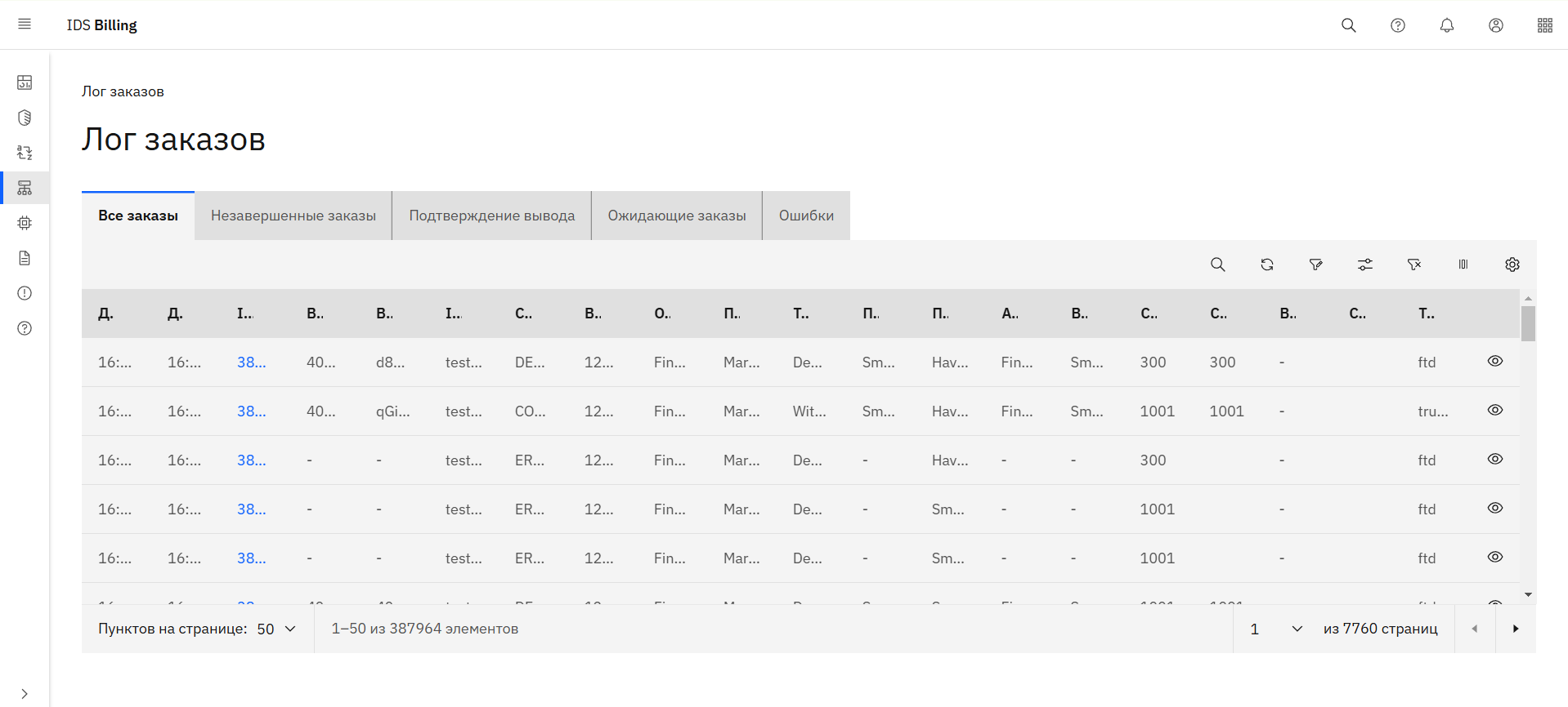Здесь отображаются все транзакции, которые зафиксировала система, и к которым есть доступ у пользователя. Сверху можно выбрать отображение всех заказов, незавершенных заказов, ожидающих подтверждения вывода, ожидающих заказов, заказов, завершившихся ошибкой.