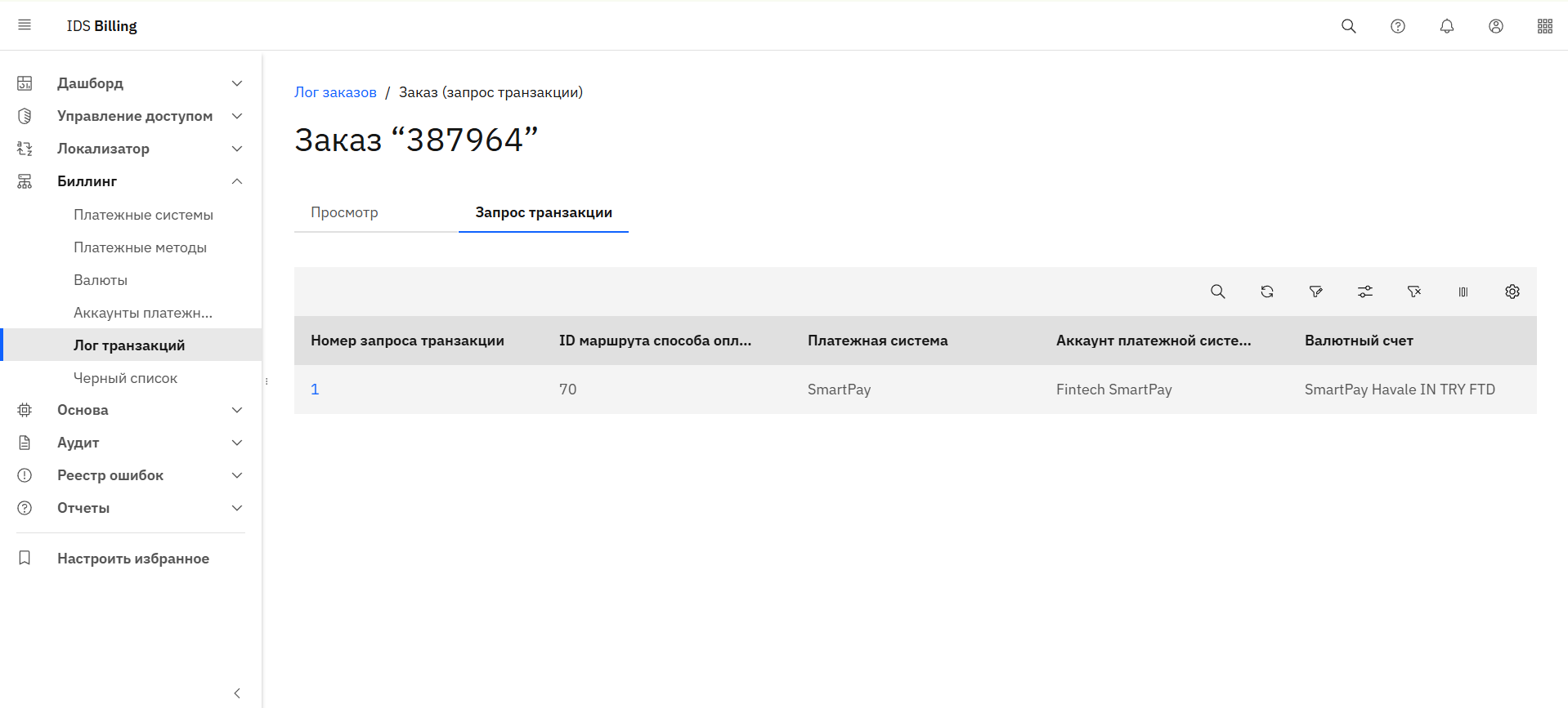 Во вкладке Запрос транзакции отображается дополнительная информация о транзакции: номер запроса и id маршрута.