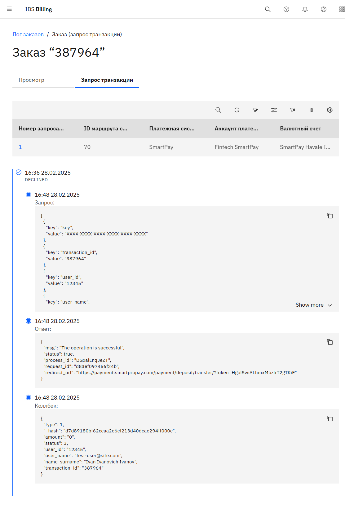 Если нажать на номер заказа, то можно изучить текст запроса, ответа, ошибки и коллбек. Это сделано для разборов инцидентов.