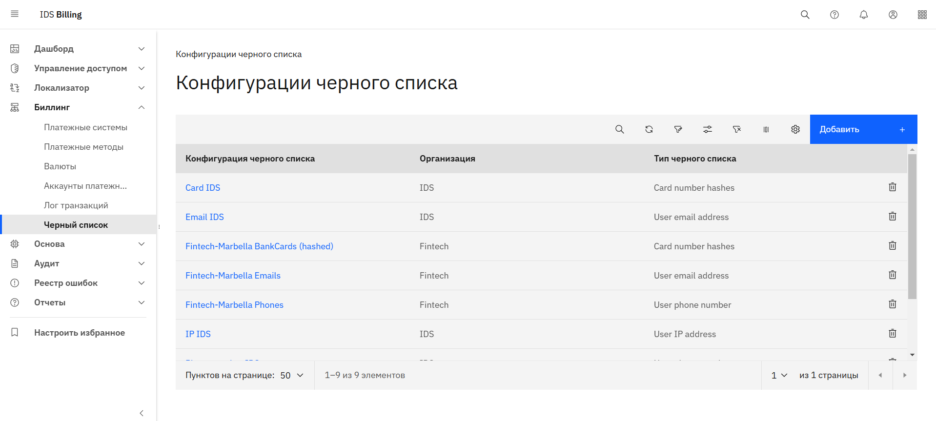 B2B Billing позволяет фильтровать входящие данные, например, сверять, есть ли данные карты в черном списке. Здесь отображаются все зарегистрированные в системе черные списки, к которым есть доступ у пользователя. Также есть возможность их создания и редактирования. Каждая организация может создавать свои черные списки или пользоваться общими (при их наличии).