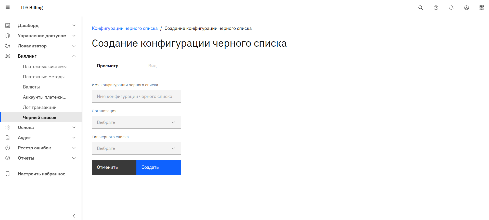 В разделе редактирования две вкладки: “Просмотр” и “Вид”. Во вкладке Просмотр можно изменить имя конфигурации черного списка.
