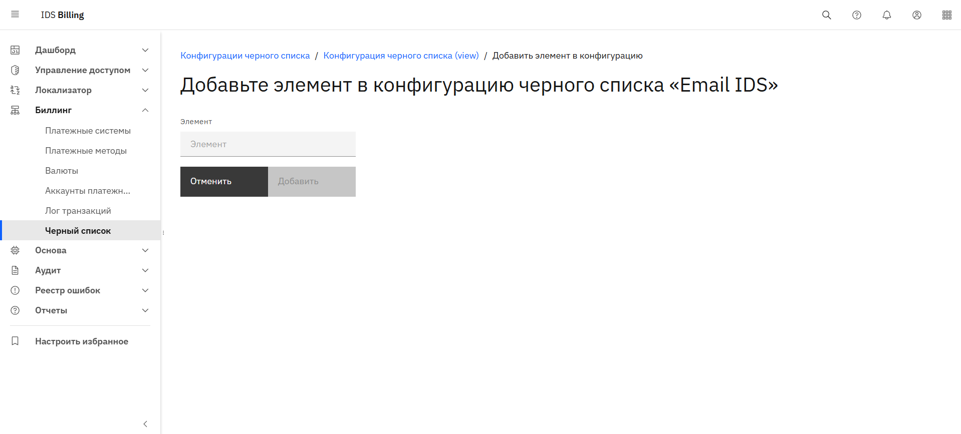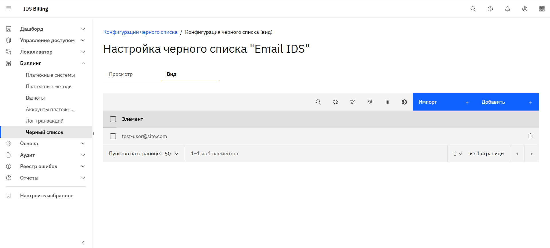Во вкладке Вид отображаются все пункты (элементы) черного списка. Любой пункт можно удалить нажав на значок корзины в правой части таблицы. Также есть возможность добавить один новый пункт кнопкой “Добавить” или импортировать готовый список элементов кнопкой “Импорт”.