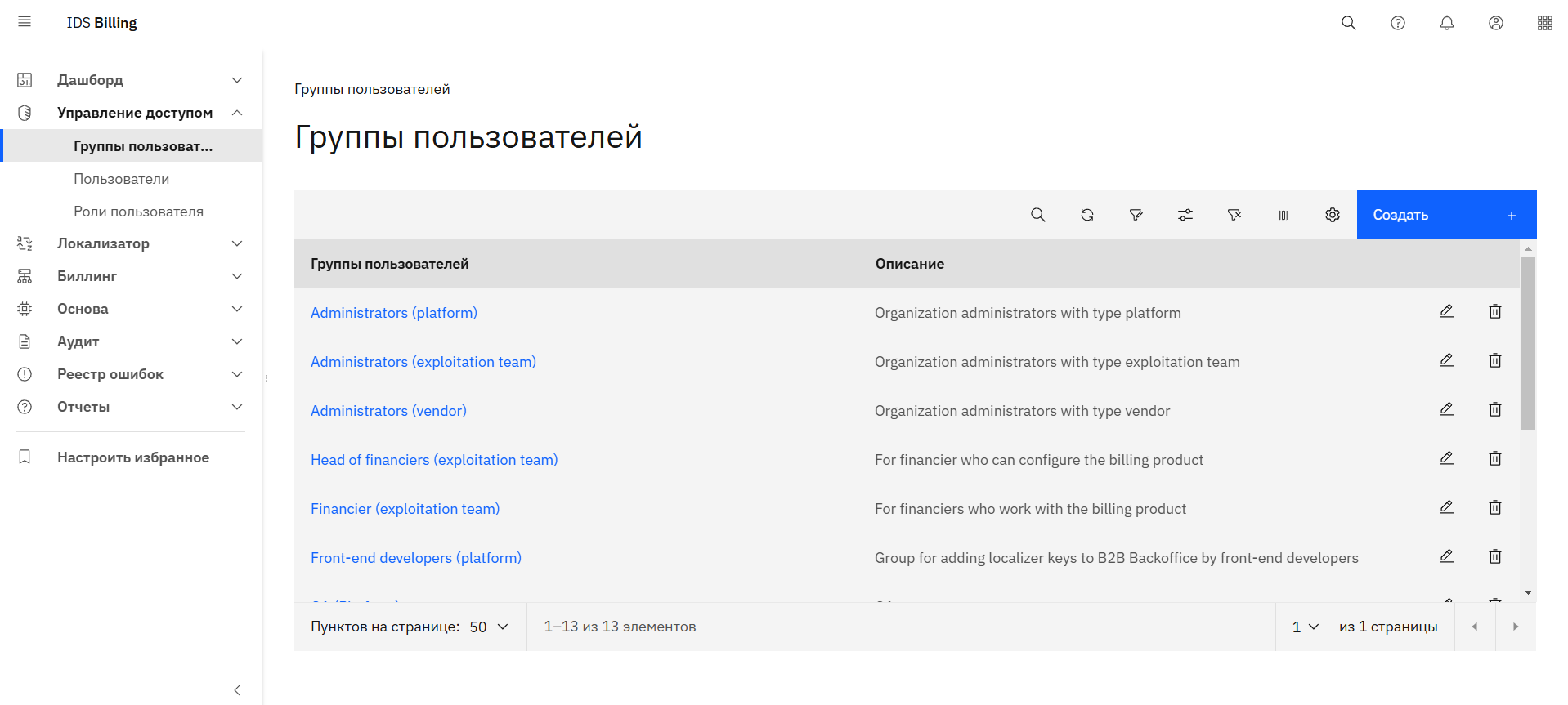 Здесь отображаются все группы пользователей, зарегистрированные в системе. Также есть возможность их создания и редактирования. Группы объединяют пользователей и роли.