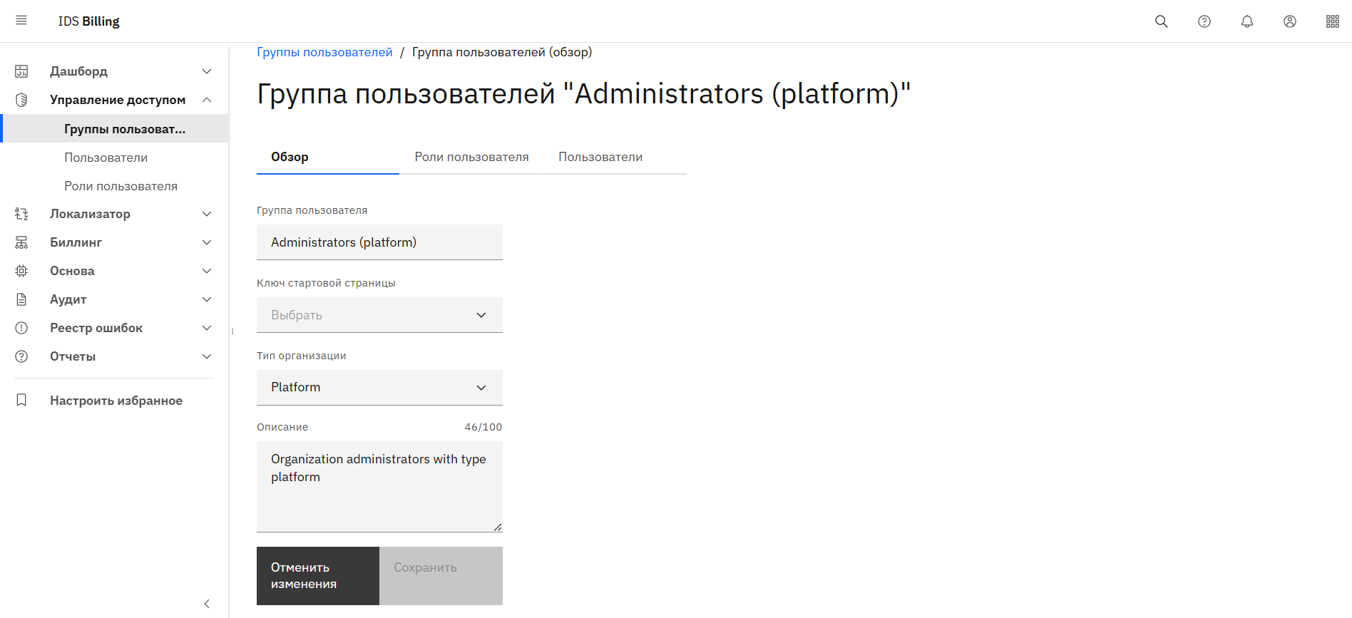 В разделе редактирования 3 вкладки: “Обзор”, “Роли пользователя”, “Пользователи”. Во вкладке Обзор можно изменить имя и описание группы, ключ стартовой страницы (на какой странице будет открываться Billing для этой группы пользователей), тип организации (платформа, вендор, команда эксплуатации).