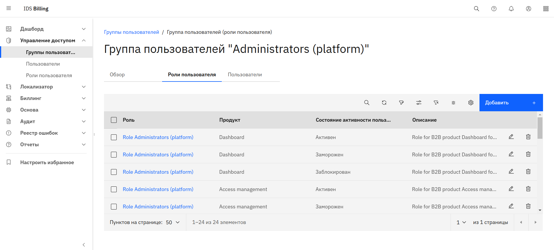 Во вкладке Роли пользователя отображаются все роли, которые установлены для данной группы, а также есть возможность их добавить или удалить. Здесь должны отображаться только те роли, которые необходимы группе для полноценной работы. Например, для группы “администратор платформы”, здесь должны быть указаны роли администратора платформы для каждого продукта в 3 состояниях: активен, заблокирован, заморожен.