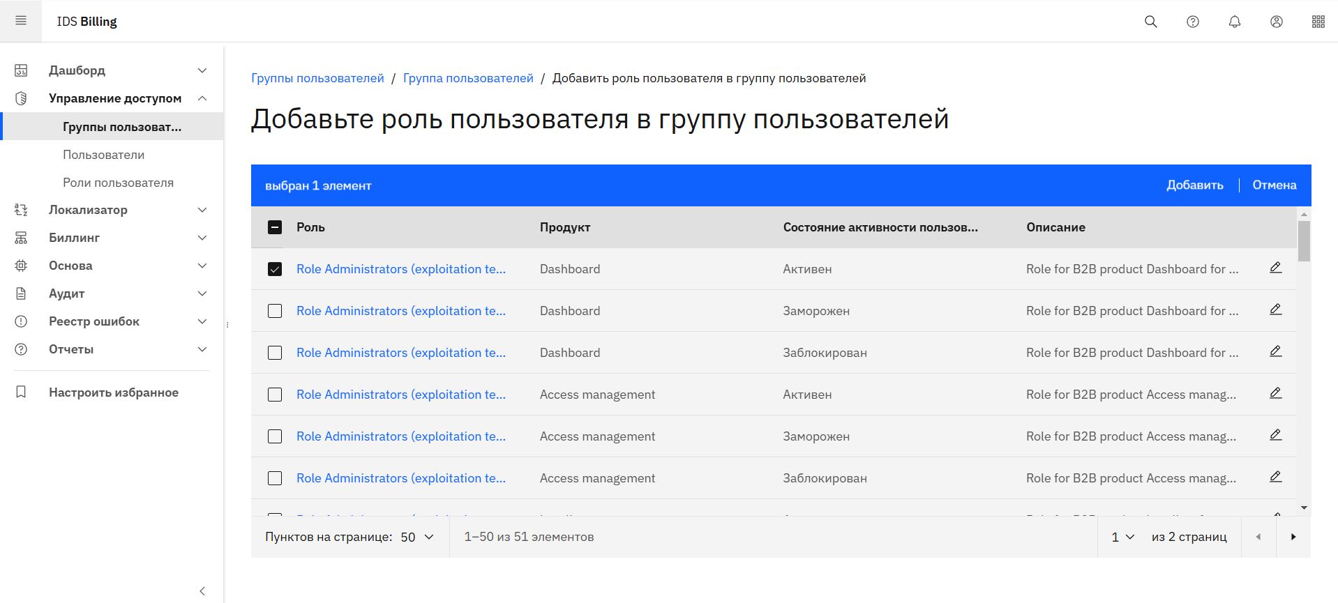 Кнопка “Добавить” перенаправляет на страницу со списком всех созданных ролей пользователя, которые можно добавить группе. Выбрав необходимые роли, нужно нажать кнопку “Добавить” в верхней части таблицы.