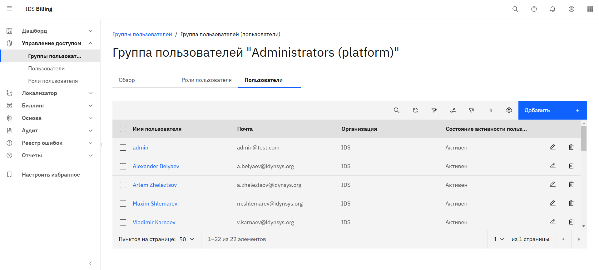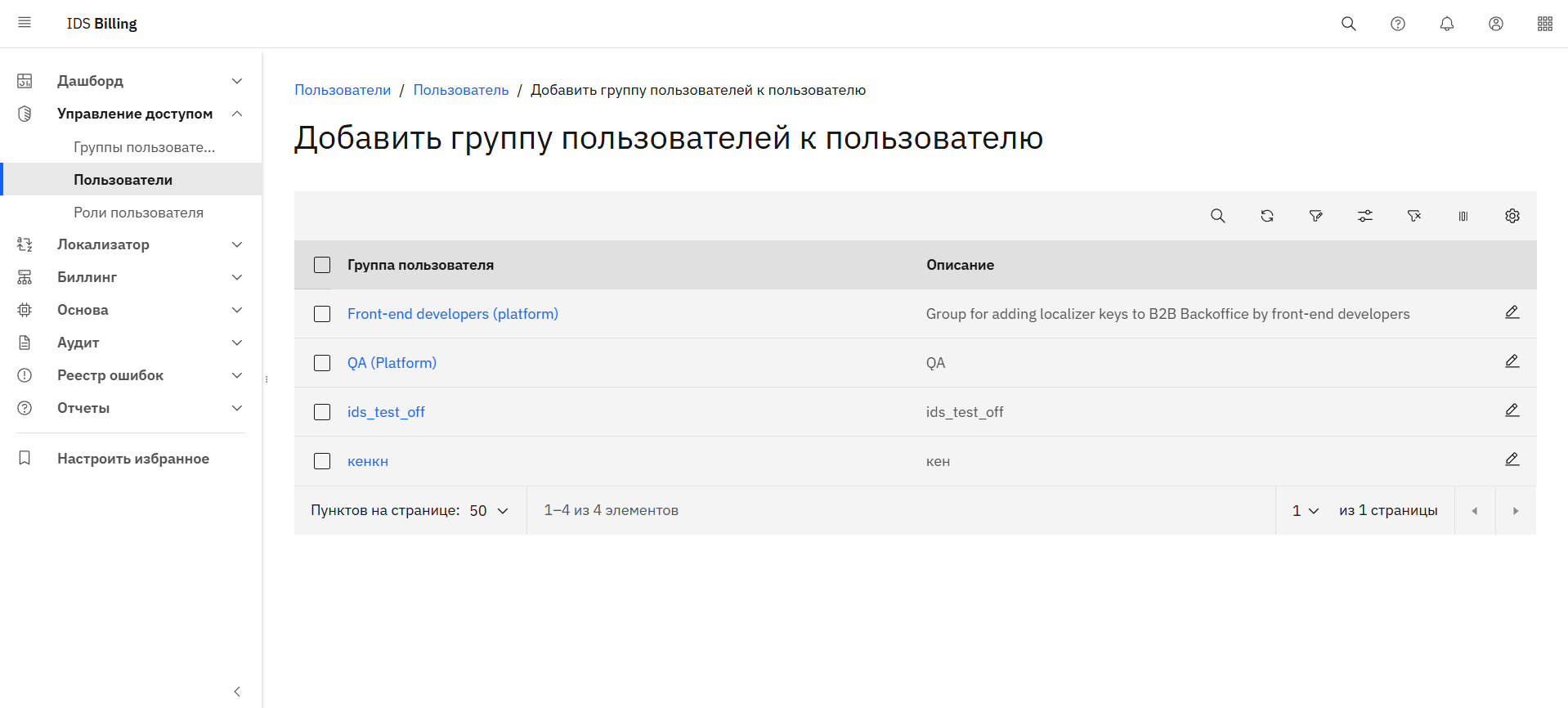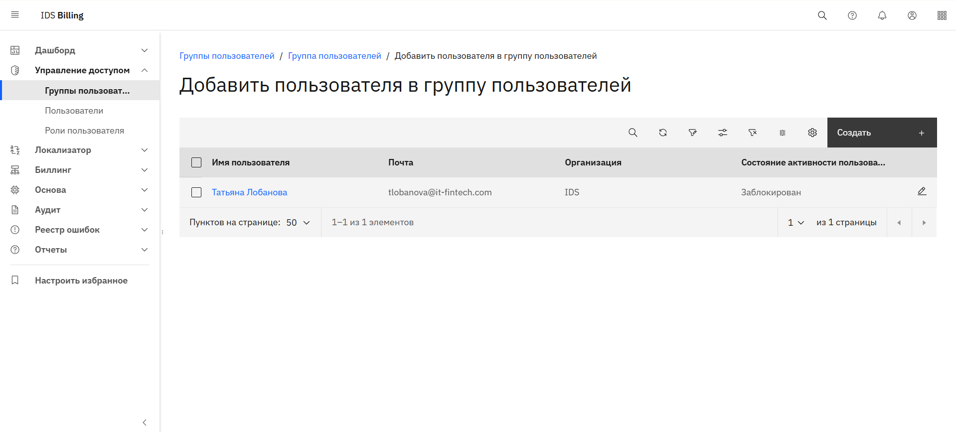Нажатие на кнопку добавить перенаправляет на страницу со списком всех пользователей, которых можно добавить в группу. Добавить можно только тех пользователей, у которых еще нет группы, и тип их организации совпадает с типом организации группы пользователей.