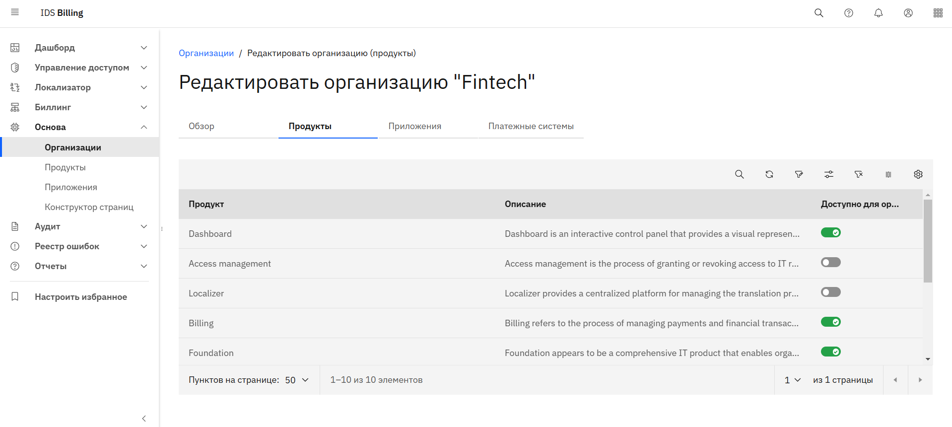Во вкладке Организации можно включать/отключать для любой организации доступ к выбранной платежной системе. По клику на название организации произойдет переход к ее редактированию в продукте Основа.