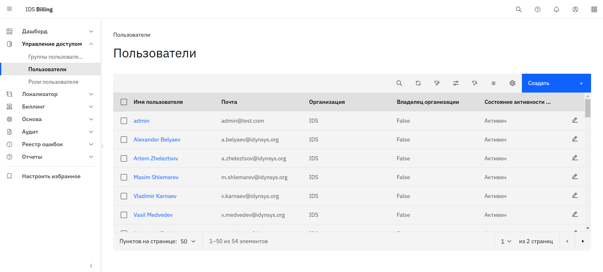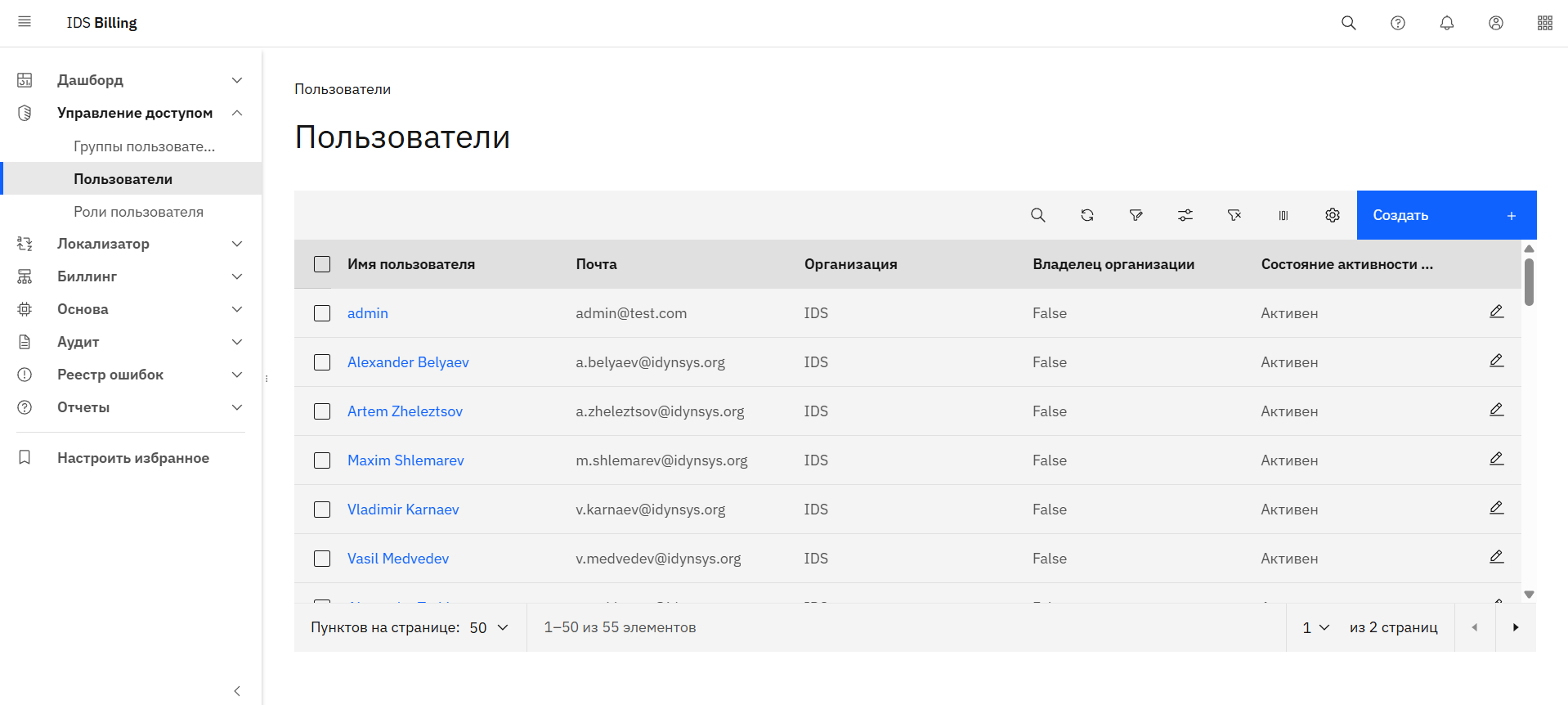 Здесь отображаются все пользователи зарегистрированные в системе. Также есть возможность их создания и редактирования.