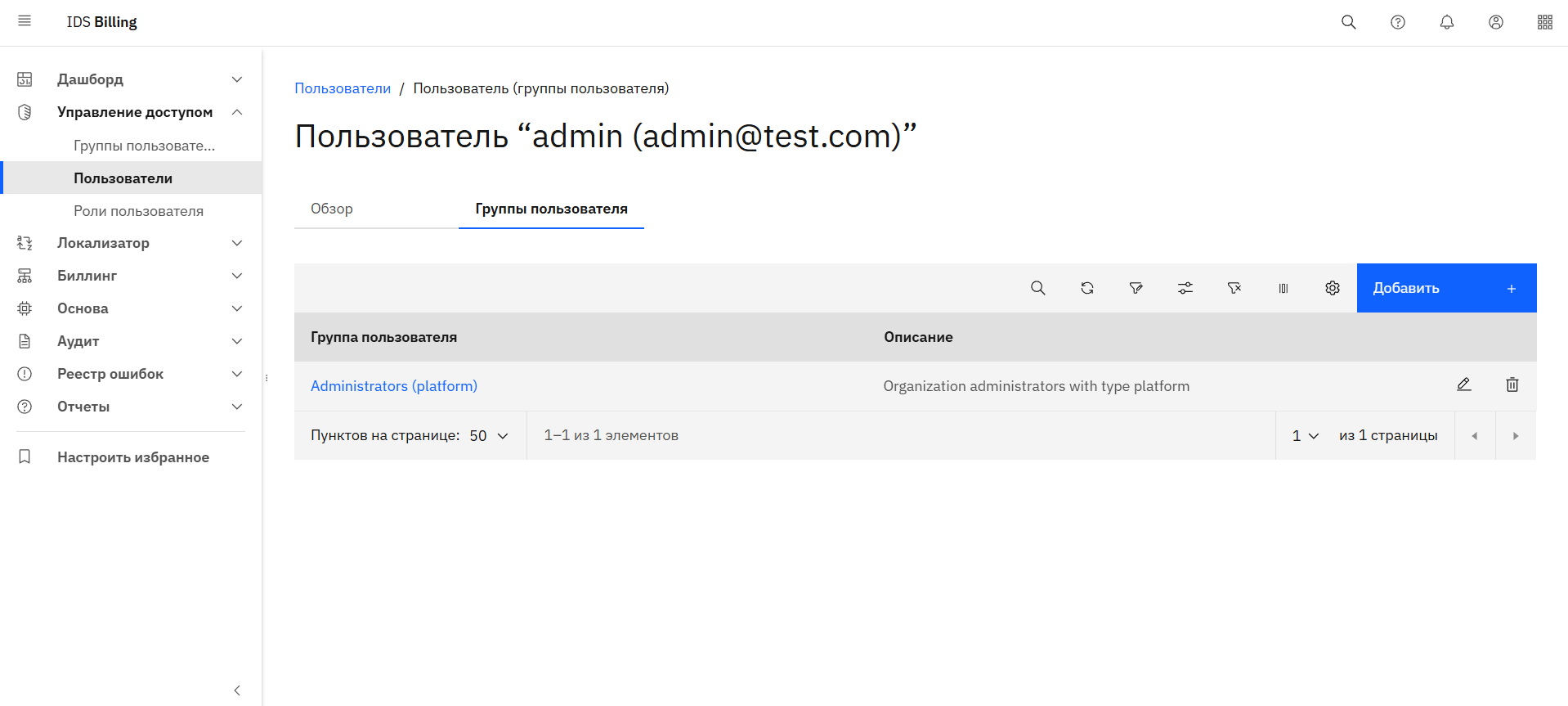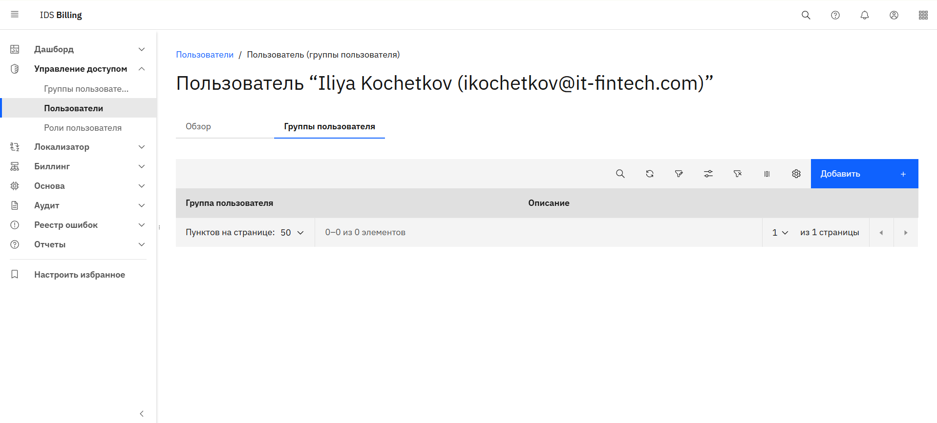 Во вкладке Группы пользователя отображается, в какие группы входит пользователь, также здесь можно добавить новые группы или удалить неактуальные. Нажатие на название группы перенаправляет в подраздел Группы пользователя.