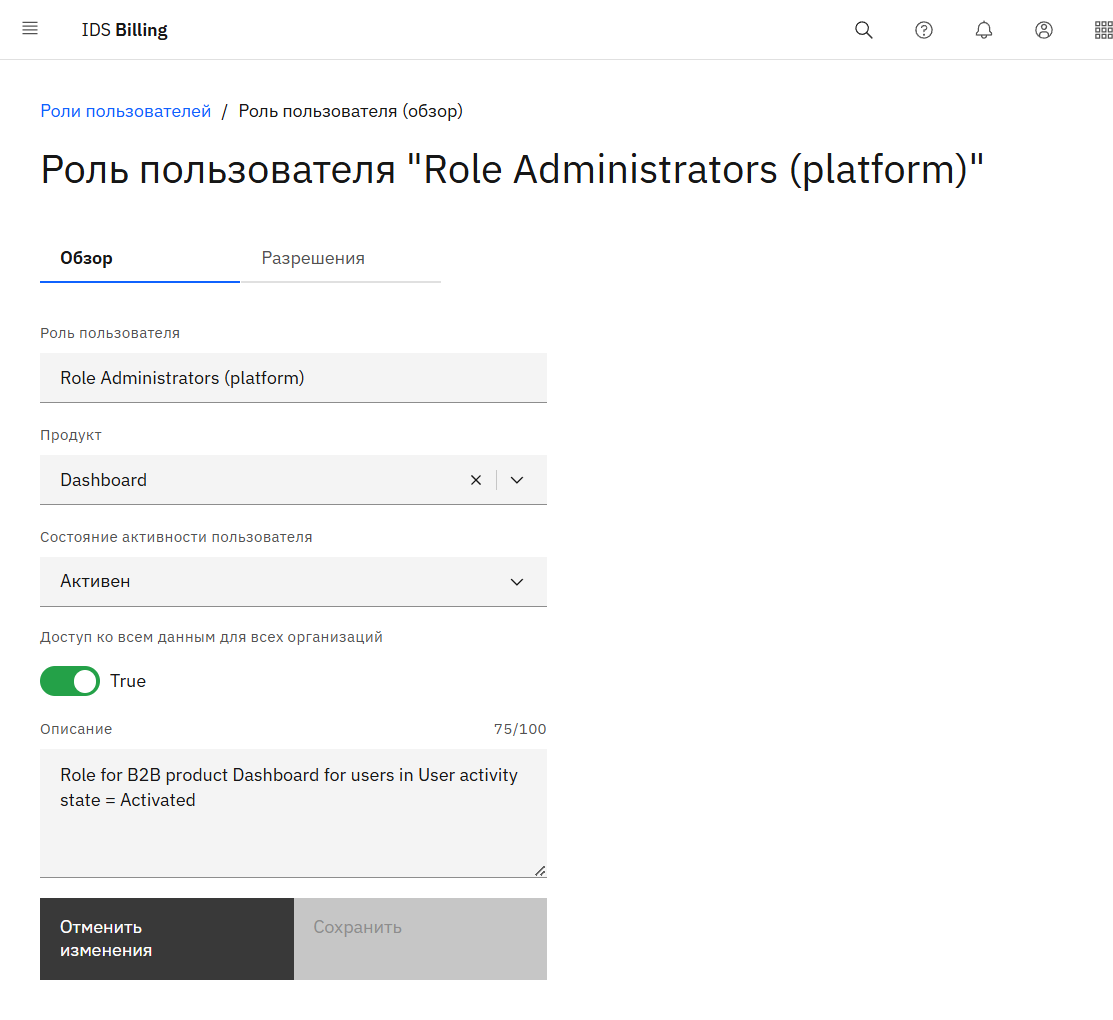 В разделе редактирования 2 вкладки: “Обзор”, “Разрешения”. Во вкладке Обзор можно изменить название и описание роли, выбрать продукт и состояние активности (активен, заморожен, заблокирован).