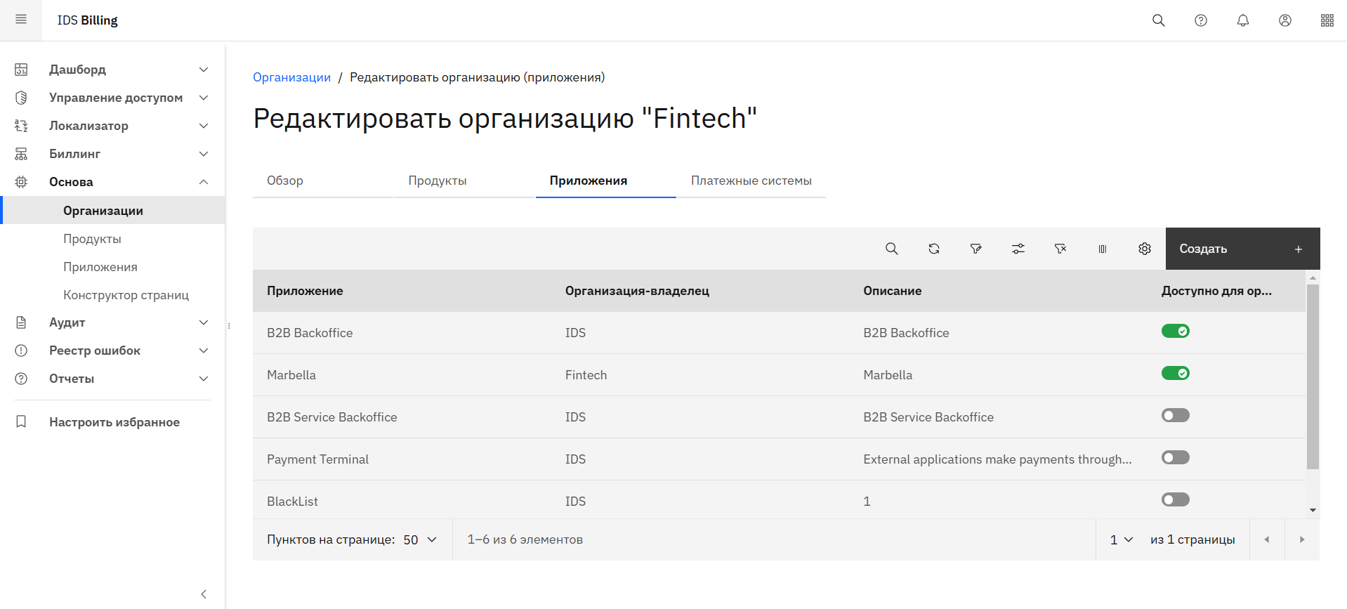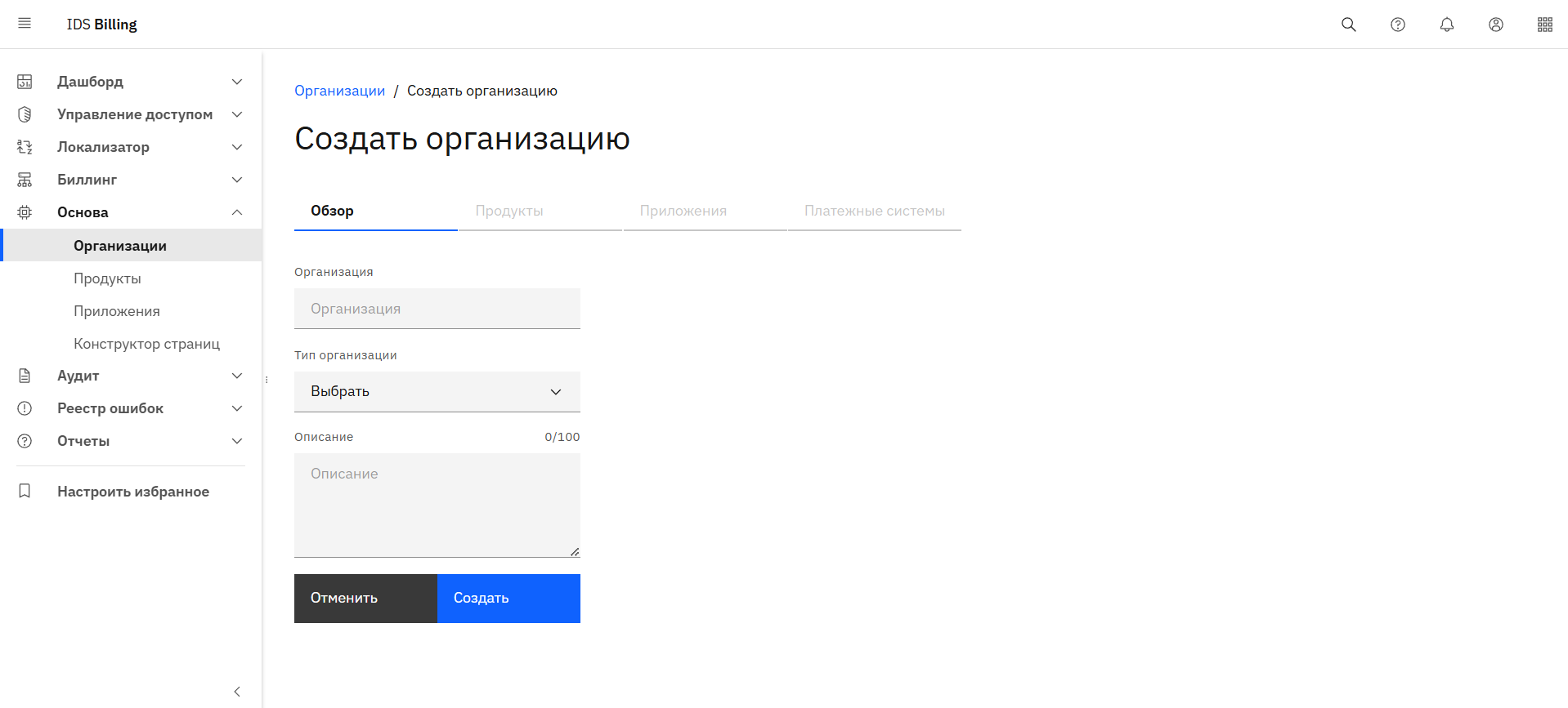 В разделе создания те же вкладки и функции, что и в разделе редактирования: “Обзор”, “Продукты”, “Приложения”, Платежные системы”. После создания новой организации, она станет доступна для редактирования и отобразится в общем списке организаций.
