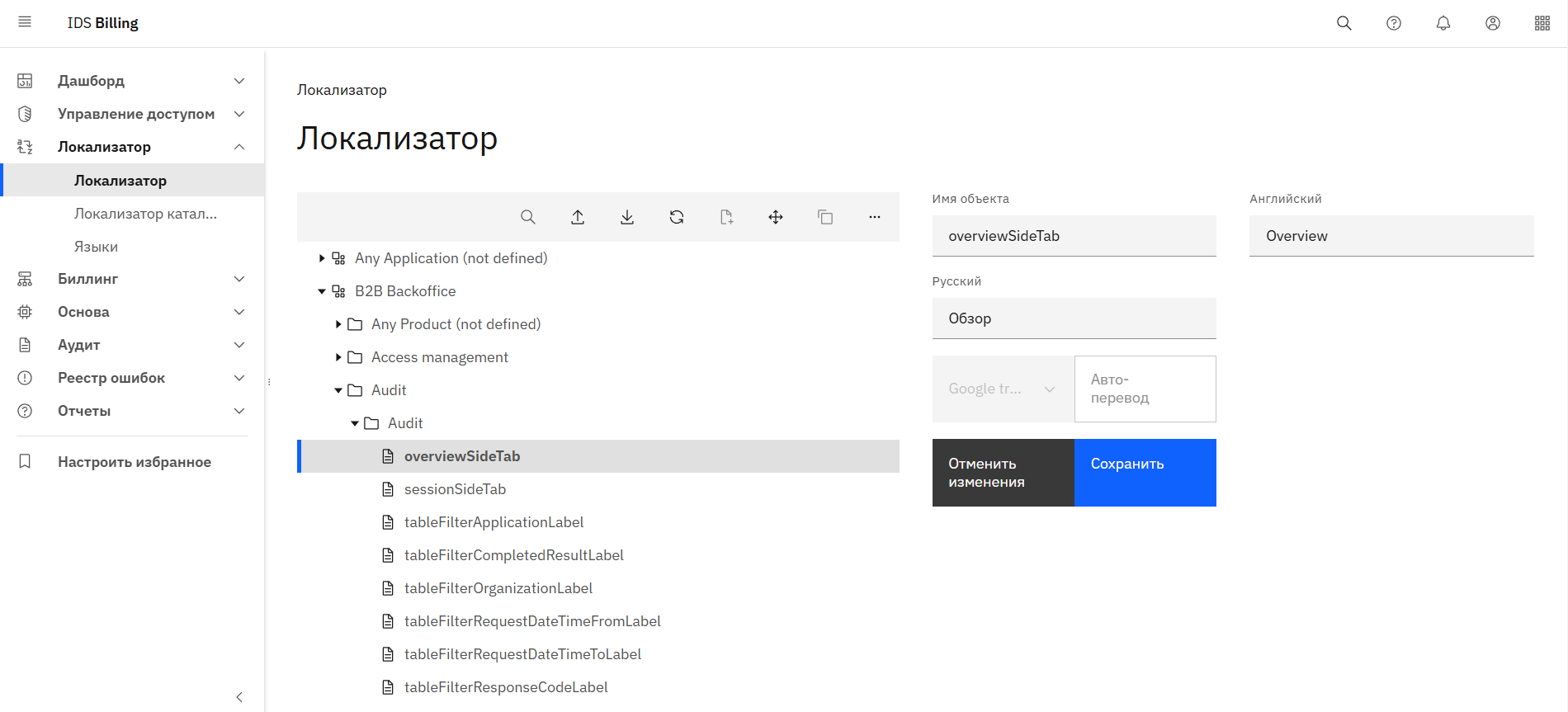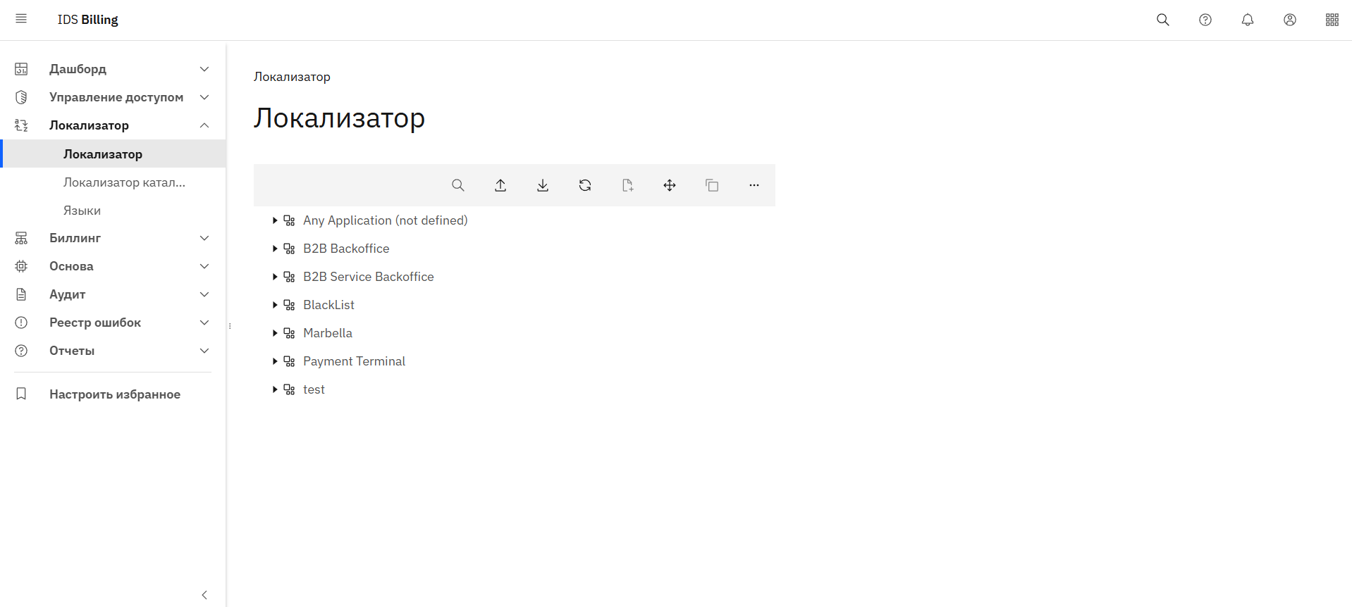Здесь отображаются все элементы страниц, которые локализует система. В локализаторе можно импортировать и экспортировать (в JSON, CSV, XML) группы элементов для локализации. Элементы группируются по приложениям, продуктам, подразделам и т.д.