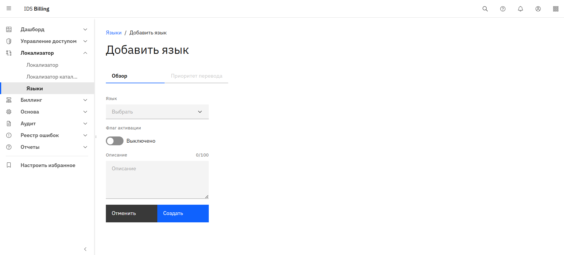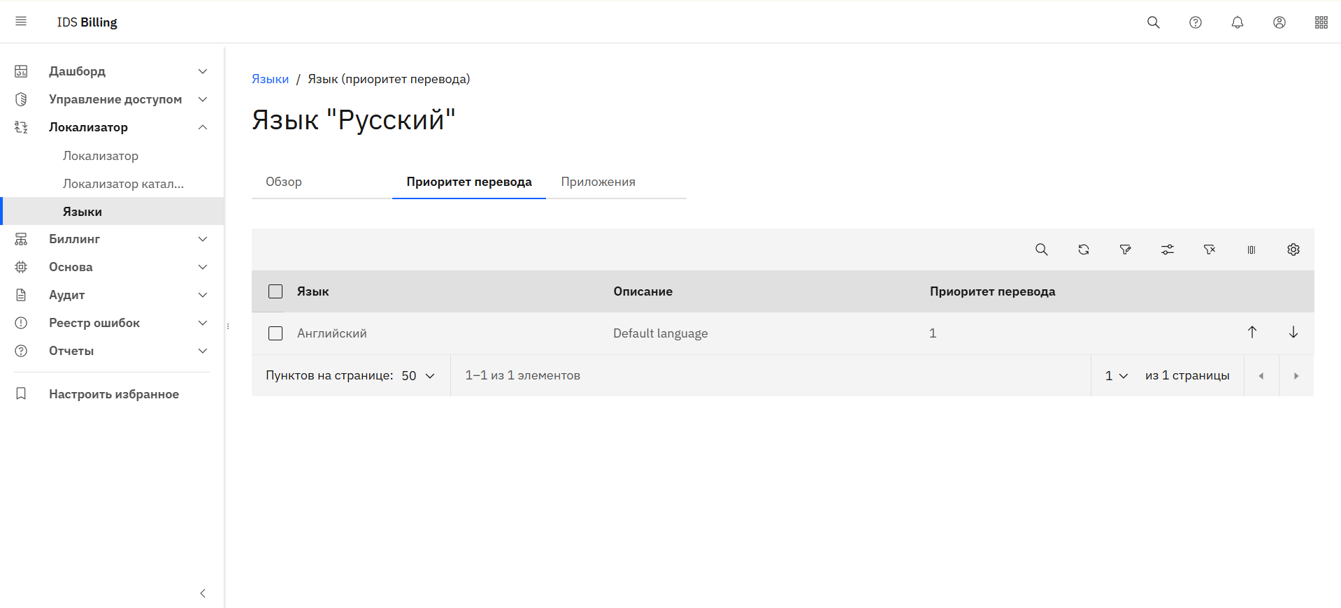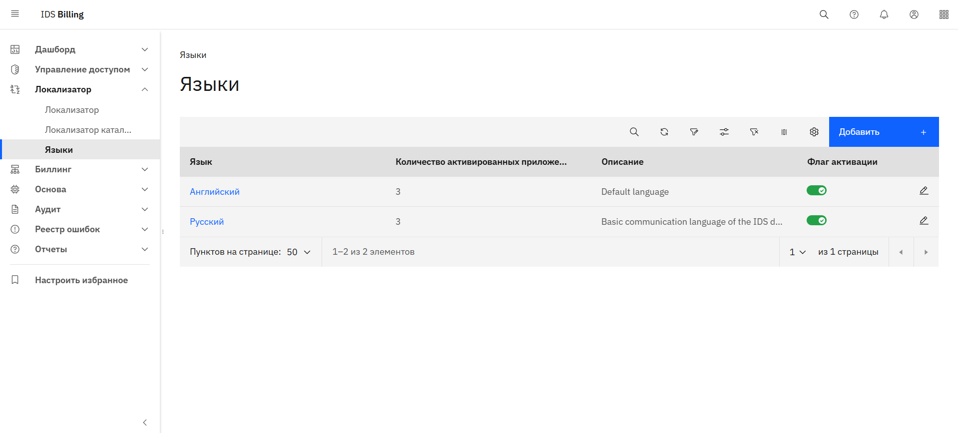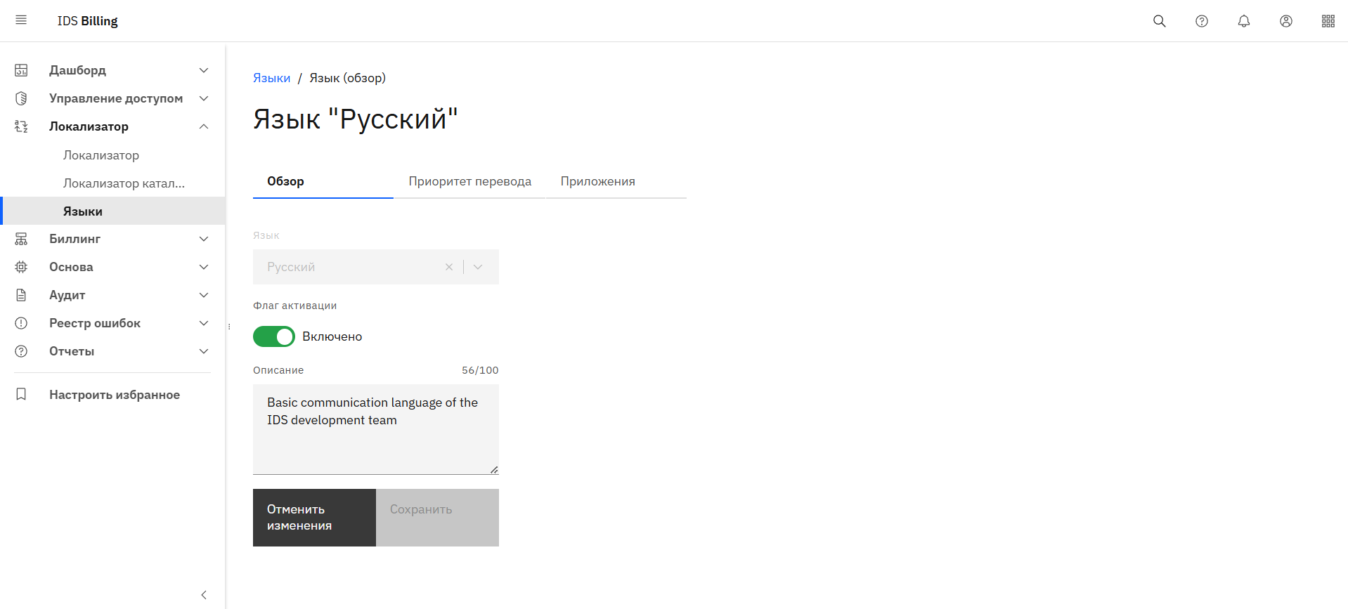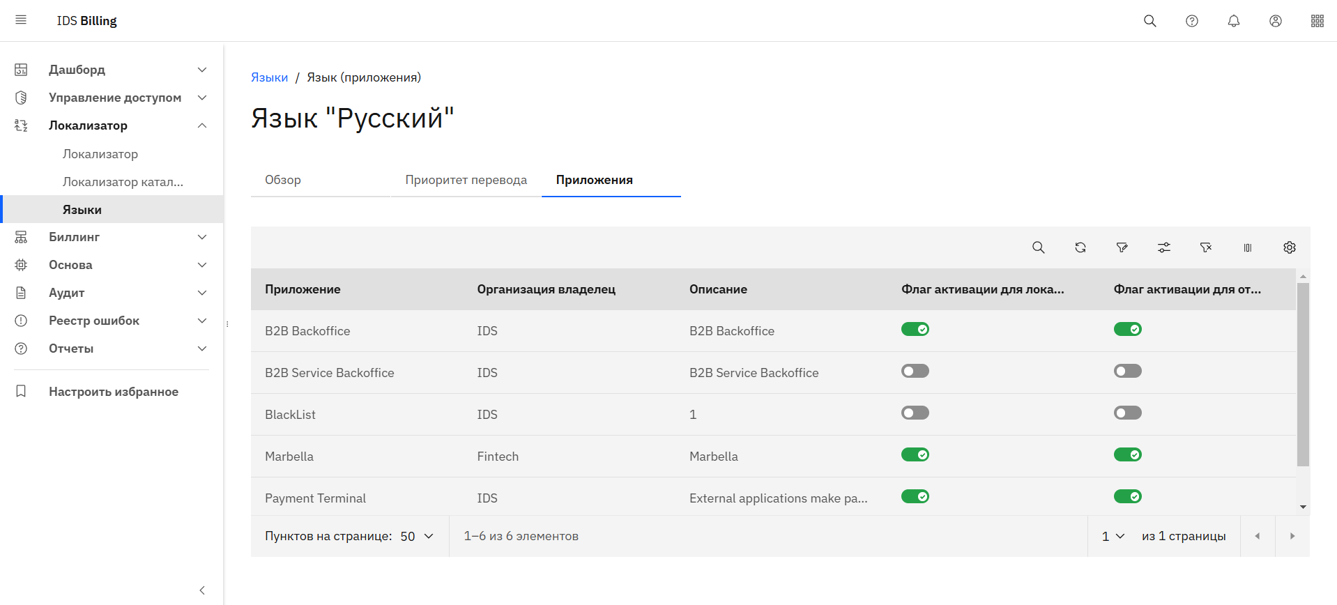 Здесь отображаются все доступные для локализации языки. Также есть возможность их создания и редактирования. У всех приложений отображаются: название, количество активированных приложений для локализации, описание. Также здесь можно быстро активировать/деактивировать язык.