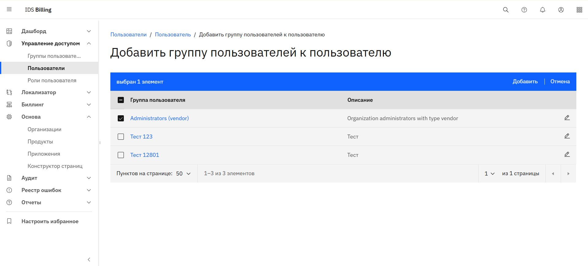 Выбрать необходимую группу с теми правами, которые потребуются пользователю. Сейчас это может быть администратор команды эксплуатации, администратор вендора и т.д.