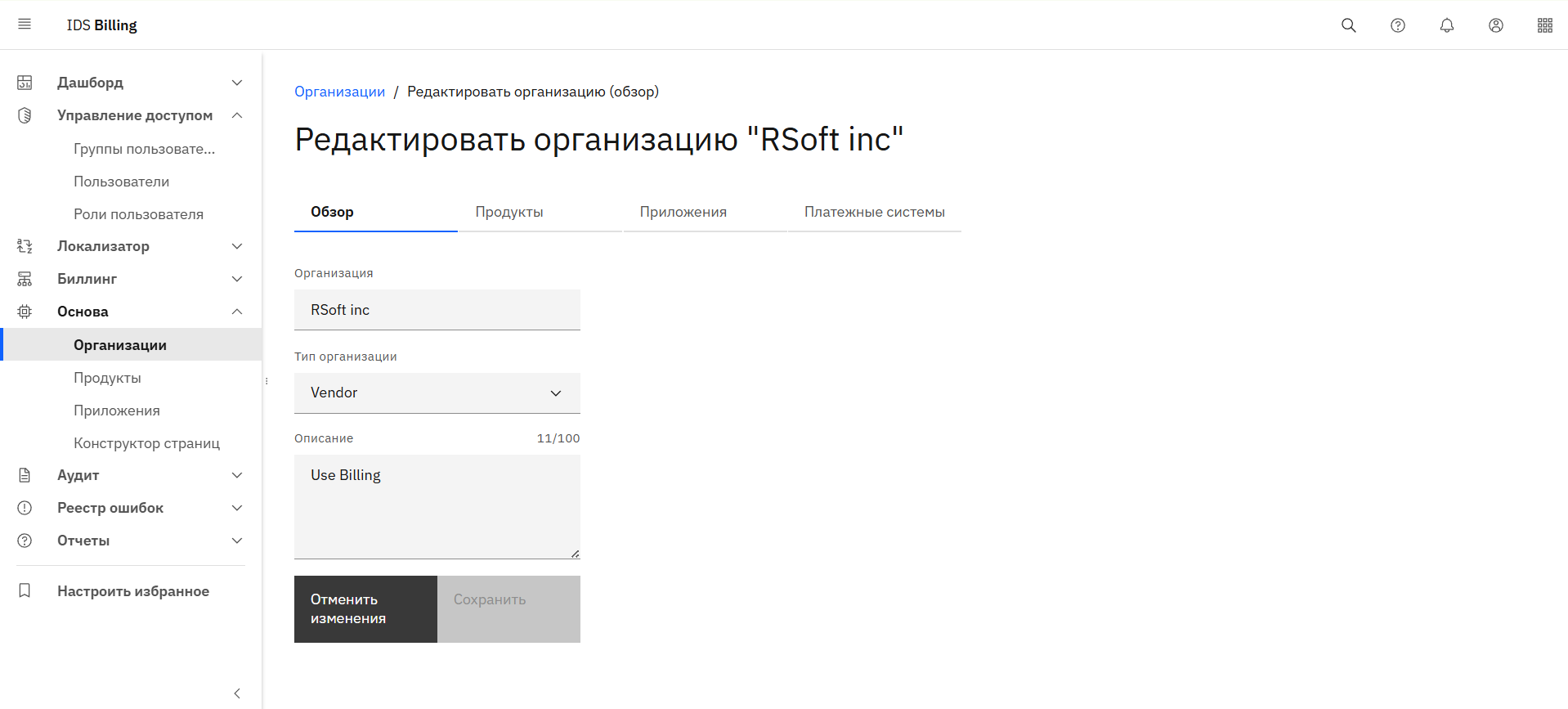 Редактировать организацию можно после нажатия на ее название. В разделе редактирования 4 вкладки: “Обзор”, “Продукты”, “Приложения”, Платежные системы”. Во вкладке Обзор можно изменить название организации, ее описание в системе и тип (тип можно поменять только у вендора или команды эксплуатации).