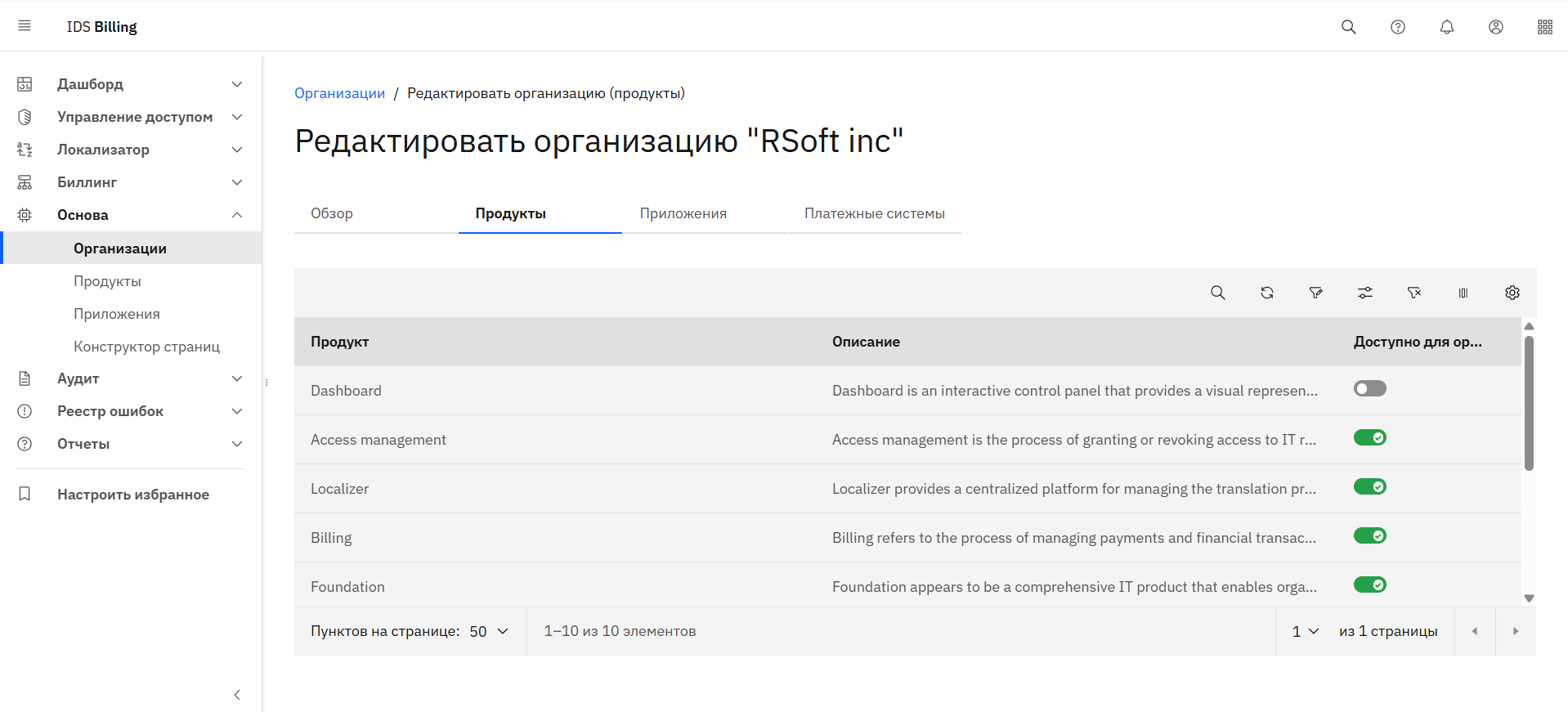 Во вкладке Продукты можно подключить или отключить у организации доступ к продуктам системы B2B Billing. Например, организация Name1 купила доступ к продукту Локализатор, здесь можно включить его для данной организации. При подключении продукта, у организации автоматически появляются нужные роли для пользователей.
