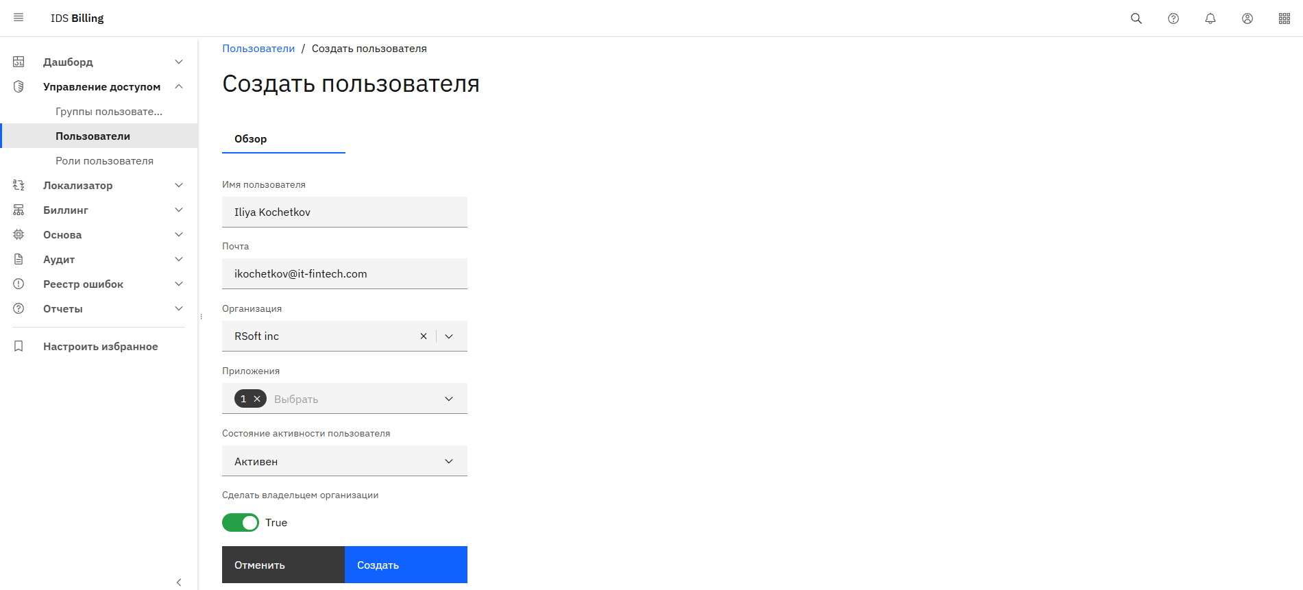 Добавить имя, почту, название организации, доступные приложения, состояние активности. Выбрать, является ли новый пользователь владельцем организации.